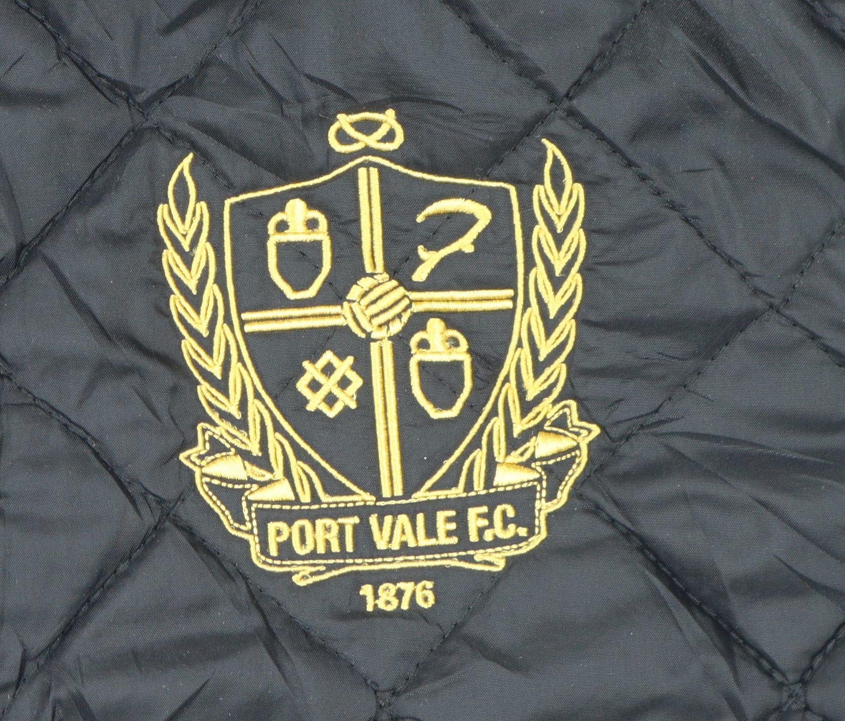 Step out in style with this Result Urban black quilted jacket, perfect for those chilly autumn and winter days. Crafted from durable nylon and featuring a warm polyester filling, this jacket offers both comfort and warmth. The jacket comes in a sleek black colour, accented with an embroidered Port Vale F.C. logo, making it an ideal choice for sports enthusiasts and casual outings alike. With its collared design and multiple pockets, it combines functionality with a fashionable look. The jacket's full-zip closure and additional snap buttons provide extra protection against the elements, making it an excellent choice for your outdoor adventures. Designed for men, this mid-length, regular fit jacket is machine washable, ensuring it maintains its quality with easy care. Don't miss the chance to own this stylish and functional jacket, making it a great addition to any wardrobe.