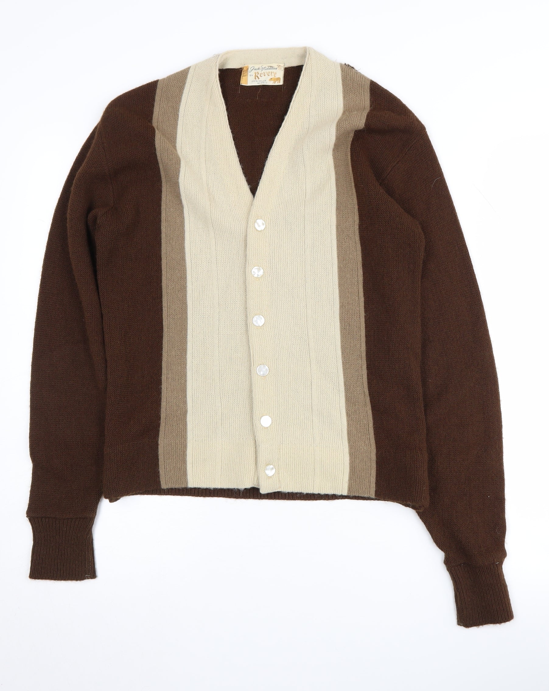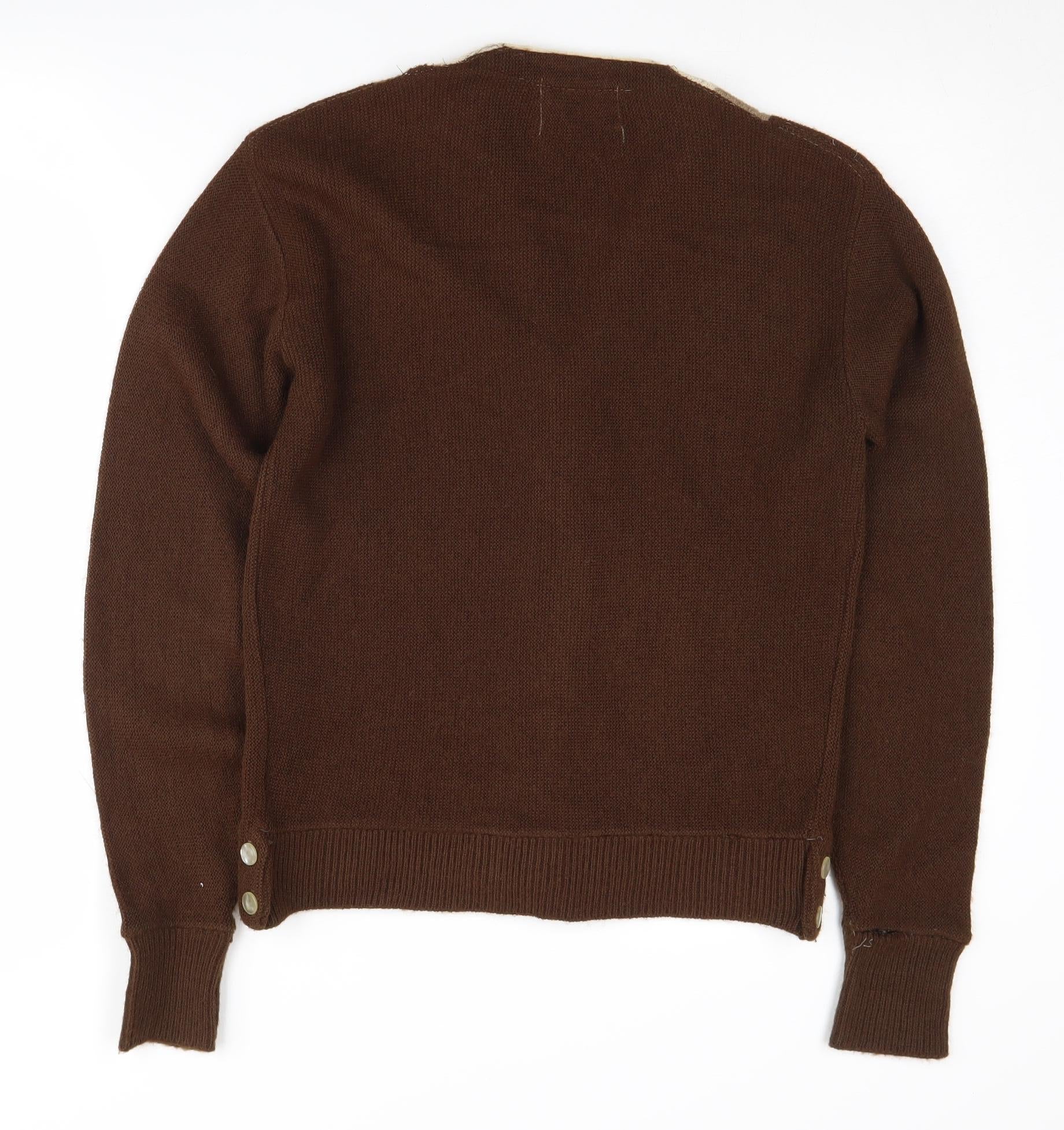 Elevate your wardrobe with this classic brown cardigan from Revere, designed for the stylish woman seeking comfort and versatility. This vintage-inspired cardigan boasts a simplistic style, featuring button accents that add a touch of elegance to any outfit. Crafted entirely from acrylic, the fabric provides a soft and cozy feel, making it perfect for layering during cooler days. The long sleeves offer warmth, while the knit fabric ensures a flexible fit that moves with you, whether you're at work, home, or out with friends.This cardigan comes in a regular size S, ideal for a comfortable and standard fit. The rich brown shade is both timeless and versatile, easily pairing with a variety of colours and styles. While this cardigan is in good condition, there is some noticeable wear on the sleeves, a testament to its vintage charm and previous journeys. This adds character and authenticity to the piece, a perfect option for adding that hint of retro to your ensemble without compromising on quality.Perfect for casual outings or adding a warm layer over a blouse for work, this cardigan is the ultimate go-to for your fashion-forward wardrobe. Given its neutral colour, it offers endless styling options, ensuring you make use of this piece across seasons.With all these features, this cardigan is an absolute steal at a price of £15. Transform your everyday look with this unique and fashionable piece that combines practicality with vintage flair. Invest in a piece of fashion history with this charming Revere cardigan, designed to seamlessly integrate into your daily ensembles.