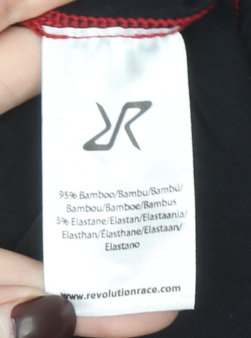 This RevolutionRace men’s 1/4 zip activewear top combines performance, comfort, and outdoor appeal in one versatile piece. Designed with an athletic fit, it is crafted from an eco-conscious blend of 95% bamboo and 5% elastane, offering a naturally breathable and moisture-wicking fabric ideal for high-intensity activities. The lightweight stretch of the material provides excellent freedom of movement, while its quick-dry properties ensure comfort throughout the day. The top features a stand-up high neck with a red 1/4 zip closure for easy ventilation, and the raglan long sleeves enhance mobility while adding a modern aesthetic. A striking camouflage pattern in shades of grey, blue, and black contrasts against the solid black body, creating a stylish and dynamic look. The red piping details add a bold touch to the design, while the RVRC logo accent along the side and back reinforces its quality and authenticity. Perfect for running, gym training, or outdoor hiking in cooler seasons, this top performs just as well as it looks. Measuring approximately 95 cm in chest size and 75 cm in length, it’s best suited for a size small in men’s activewear. The soft and breathable knit bamboo fabric regulates temperature for optimal comfort across a range of outdoor activities. Despite light general signs of wear, the garment remains in excellent overall condition with no major flaws. Machine washable for easy care, this RevolutionRace top brings together practicality, modern style, and durability, making it a versatile choice for everyday performance wear. Ideal for autumn and winter workouts or outdoor excursions, it’s a must-have for anyone who values comfort, style, and sustainability in their activewear collection.