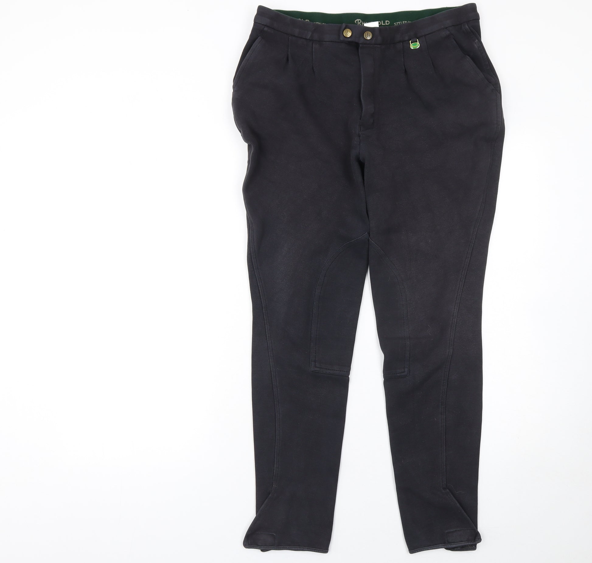 Upgrade your riding wardrobe with these Rhinegold men’s black riding trousers, tailored for both comfort and performance. Made from a durable 95% cotton and 5% Lycra woven fabric, they offer a comfortable stretch fit that moves with you in the saddle. The material is breathable yet strong, providing a smooth fit and long-lasting wear for equestrian activities. Designed in a classic slim fit with a tapered leg and reinforced panel detailing, these trousers offer a secure and professional appearance. The black colour adds versatility, pairing easily with a range of riding tops, jackets, and boots. The trousers feature a button and zip fastening for a secure closure and convenient side pockets for small essentials. The stretch fabric ensures ease of movement whether riding or working around the yard. Ideal for autumn, spring, and winter seasons, they provide warmth without bulk. With practical features such as comfort stretch and durability, these trousers are perfect for casual and active equestrian use. Condition is very good, showing only minimal signs of wear with no visible flaws or damage. Rhinegold, known for reliable riding apparel, brings classic style to your equestrian look with these trousers designed for performance and everyday use. A great choice for riders seeking practical design and timeless comfort. Whether for training, competition warm-up, or leisure riding, these Rhinegold trousers will meet your needs with ease. Clean, structured lines and a flattering fit ensure that you look sharp both on and off the horse. Don’t miss out on adding this versatile pair to your activewear collection for effortless equestrian performance and comfort every day.