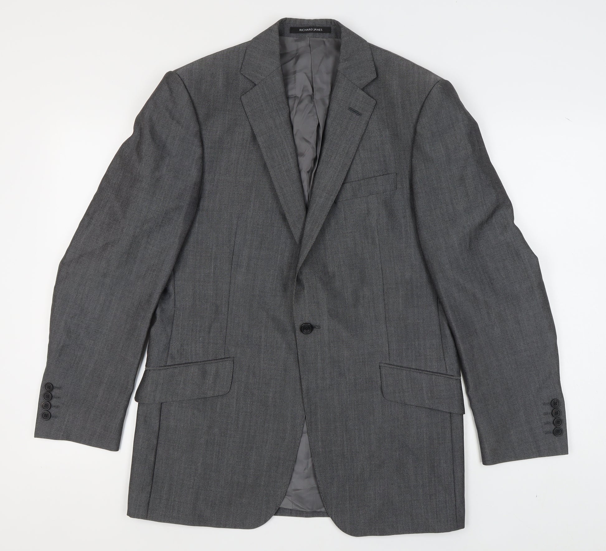 Elevate your wardrobe with this stylish Richard James Grey Wool Blazer, perfect for making a sophisticated impression. Crafted for men, this regular fit jacket in size 40 R combines classic tailored elegance with modern design elements, ideal for business occasions and professional settings. Its timeless design features a single-breasted two-button front, complemented by a notch lapel style for a refined appearance. The double-vented back ensures excellent fit and comfort, while the four-button sleeves add to its elegant aesthetic. Made from high-quality wool, the blazer is perfect for autumn and winter, providing warmth without compromising on style. The lining is crafted from Viscose/Rayon ensuring a smooth fit and excellent durability. Presented in a versatile grey, this blazer matches effortlessly with a variety of colours and patterns, making it a staple piece in any gentleman's wardrobe. Despite being slightly worn, the blazer remains in excellent condition, ensuring it adds a touch of class to any formal ensemble. Secure this classic piece today and enjoy a premium look that stands the test of time.