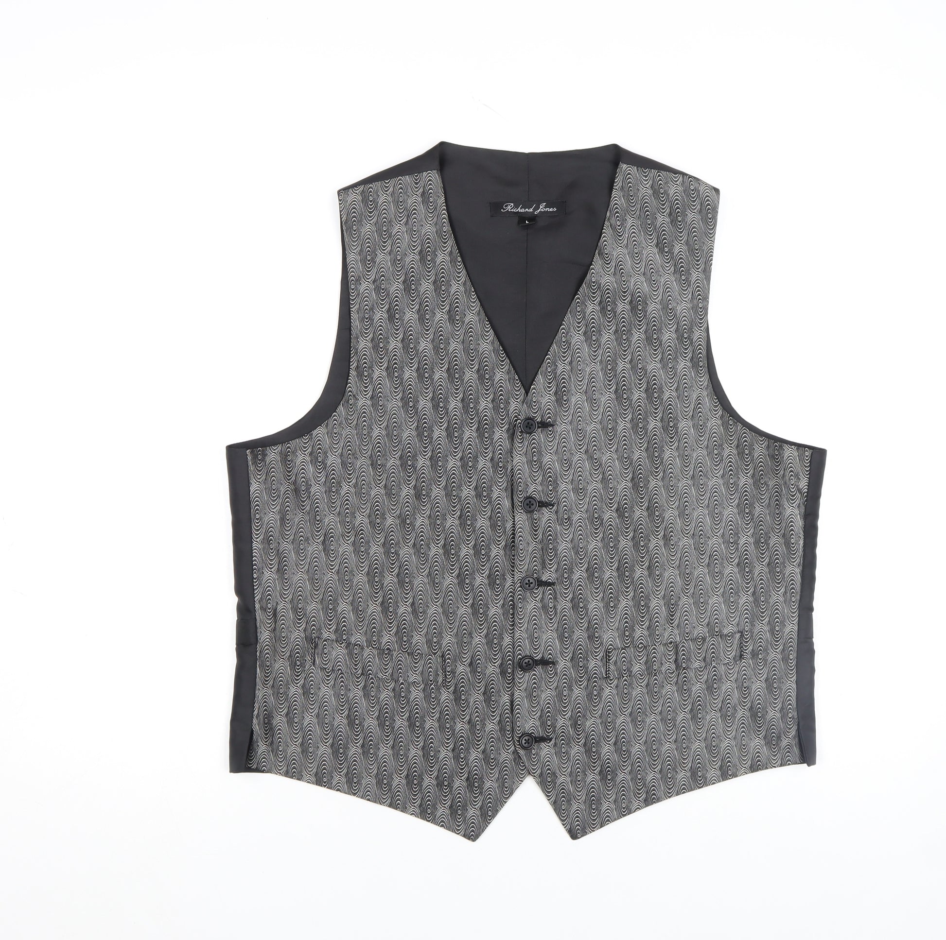 Step into timeless elegance with this distinguished Richard Jones men's waistcoat in size Large. Designed in a sharp grey geometric pattern, this waistcoat is ideal for formal, business, and smart-casual occasions. The sophisticated design features five front buttons, a deep V-neckline, and an adjustable back strap, allowing for a customised and flattering fit. Perfect for pairing with a crisp white shirt and tailored trousers, this piece enhances both modern and classic wardrobes alike. The waistcoat’s refined aesthetic ensures it complements a range of suits or can be worn alone for a confident smart-casual look. Crafted with attention to detail, the smooth material and structure provide a tailored appearance that delivers both comfort and durability. The understated style keeps it versatile, while the geometric pattern adds a discreet touch of character. Whether you’re attending a wedding, business meeting, or evening event, this waistcoat will add polish to your ensemble without appearing overly formal. Its classic styling ensures it remains a wardrobe staple for years to come. In excellent condition with no visible signs of wear or damage, this piece is ready to wear and maintain its refined finish. A wardrobe essential for any gentleman seeking a smart tailored look. Priced competitively for a quality designer piece, this Richard Jones grey waistcoat makes an ideal addition to your collection, offering smart sophistication and enduring style in one effortlessly versatile garment.