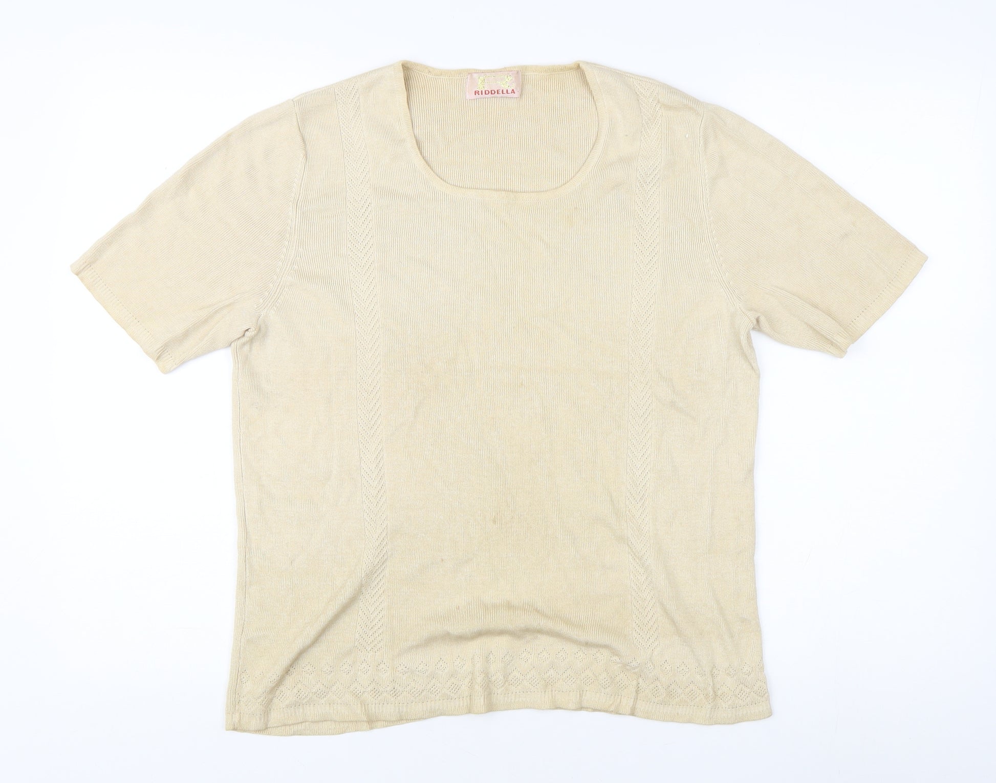 Elevate your wardrobe with this charming Riddella beige top, perfect for any casual outing. Designed for women, it features short sleeves and a classic round neck, offering a blend of comfort and style. The top is made from a soft knit fabric composed of a blend of 50% viscose and 50% cotton, ensuring a breathable and comfortable fit. The solid beige colour adds a touch of elegance, making it easy to pair with any outfit for a versatile look. Suitable for regular size women, this top boasts a basic style that makes it a wardrobe staple. Ideal for casual occasions, it can be styled effortlessly with jeans or skirts, making it a go-to piece for everyday wear. Despite being slightly worn, this top remains in excellent condition with no visible stains, offering a polished yet cosy look. With its simple design and comfortable fit, this Riddella top is a must-have for those who appreciate classic, understated fashion. Get ready to impress with this versatile piece that complements your style effortlessly.