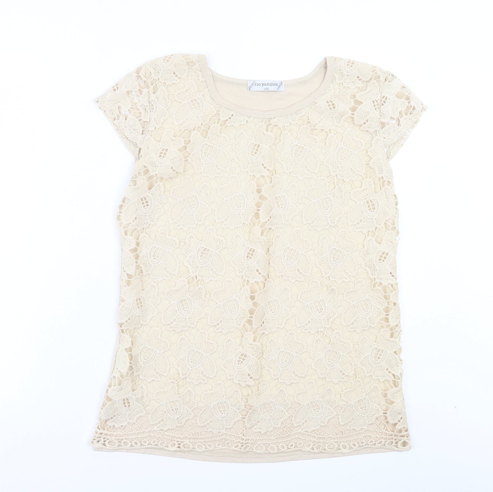 Womens Beige Floral Polyester Basic Blouse Size L Crew Neck