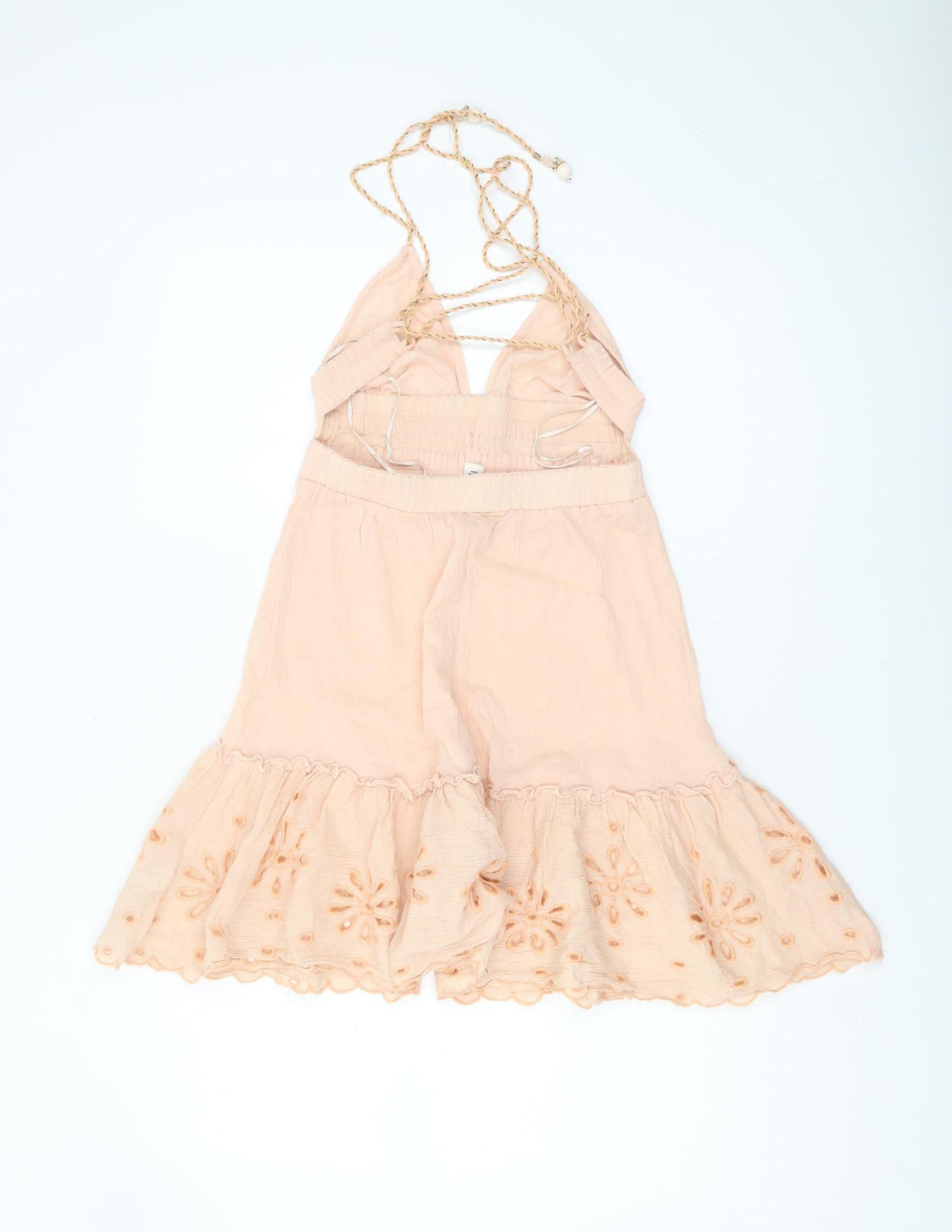 Step out in style with this beautiful beige halter dress from River Island, perfect for the summer. Crafted from 100% cotton, this dress offers a comfortable and breathable fit, making it an ideal choice for casual outings. The dress features a sleeveless design with strappy sleeves, adding a touch of elegance. Its woven fabric along with embroidered accents adds a unique charm to the piece. The backless design further enhances its chic appeal, making it perfect for warm sunny days. This XS dress is tailored for the regular size type, ensuring a flattering fit for women. Its fine quality and excellent condition prove to be a stylish yet practical addition to any wardrobe. Pair it with sandals for a relaxed brunch or dress it up with accessories for an evening stroll. This versatile dress is sure to become a go-to favorite for the season.
