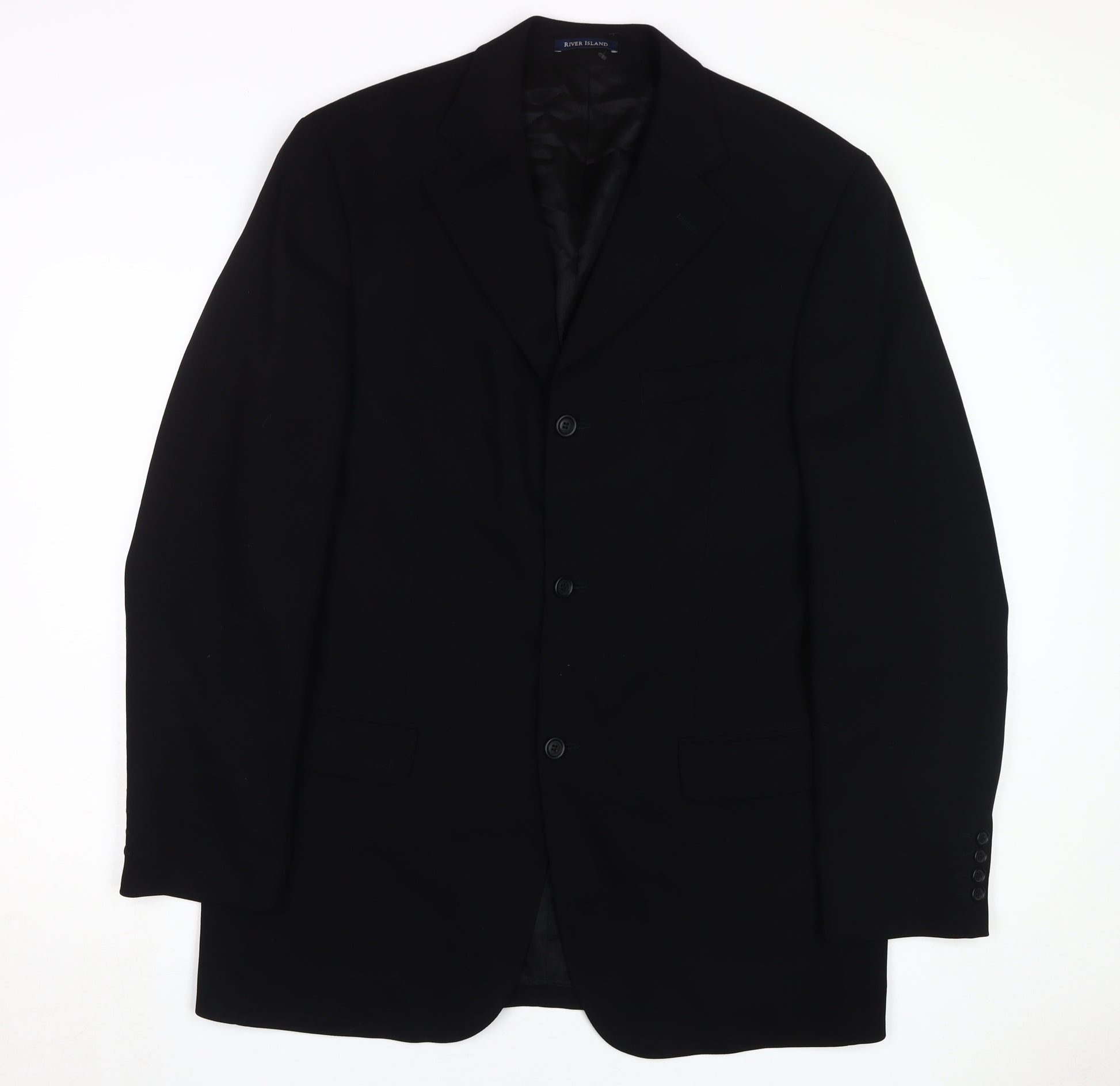 Elevate your wardrobe with this sophisticated River Island men's blazer in a classic black hue, perfect for business or formal occasions. Expertly tailored to a size 42L, this single-breasted blazer features a two-button front and notch lapels that define its elegant silhouette. Crafted from a premium blend of 70% wool and 30% polyester, this jacket ensures comfort and durability, making it a staple for colder months like autumn and winter.The blazer’s long length offers a refined appearance, while the single-vented back provides a comfortable fit and ease of movement. Its lining, made of viscose/rayon and acetate, adds an extra layer of comfort against your skin.Pair this blazer with smart trousers for a business-ready outfit or dress it down with jeans for a more casual yet polished look. Its versatile nature and understated design make it a must-have for any fashion-forward man. Dry clean only to maintain its pristine condition.Experience the blend of style and functionality with this timeless black blazer from River Island, designed to last and impress with every wear.