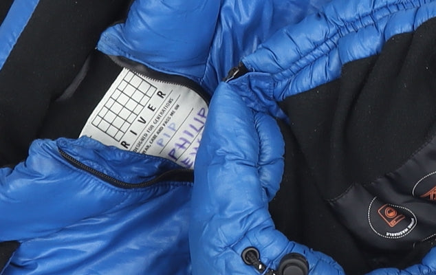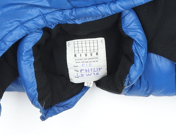 Keep your little one warm and stylish this winter with this River Island blue puffer jacket. Perfectly designed for boys aged 2-3 years, it features a cosy fleece lining that provides excellent insulation against the cold, while the durable polyester outer shell offers reliable weather protection. The jacket’s modern winter-ready design includes a full front zip for easy fastening, complemented by a button detail at the collar for extra wind protection. It also includes functional zipped pockets ideal for keeping small essentials safe, and elasticated cuffs and hem for a snug fit that keeps warmth in. The adjustable hem toggles allow for a comfortable custom fit, making it a practical and versatile piece for everyday wear or outdoor adventures. The mid-length cut offers great coverage without restricting movement, and the hood provides extra protection from wind and rain. The bold blue colour gives a fun, energetic look that pairs easily with casual outfits, whether for school runs, playground fun, or family outings. Made from 100% polyester for durability and easy care, it’s machine washable and built to last through the seasons. Though gently used, it remains in very good condition with only minimal signs of wear and a name written inside the label, showing it has been well cared for. This River Island winter jacket combines dependability, comfort, and style, making it a fantastic choice for your child’s cold-weather wardrobe. At a great value, this high-quality coat is a smart purchase that ensures warmth, comfort, and a touch of fashionable flair every time it’s worn.