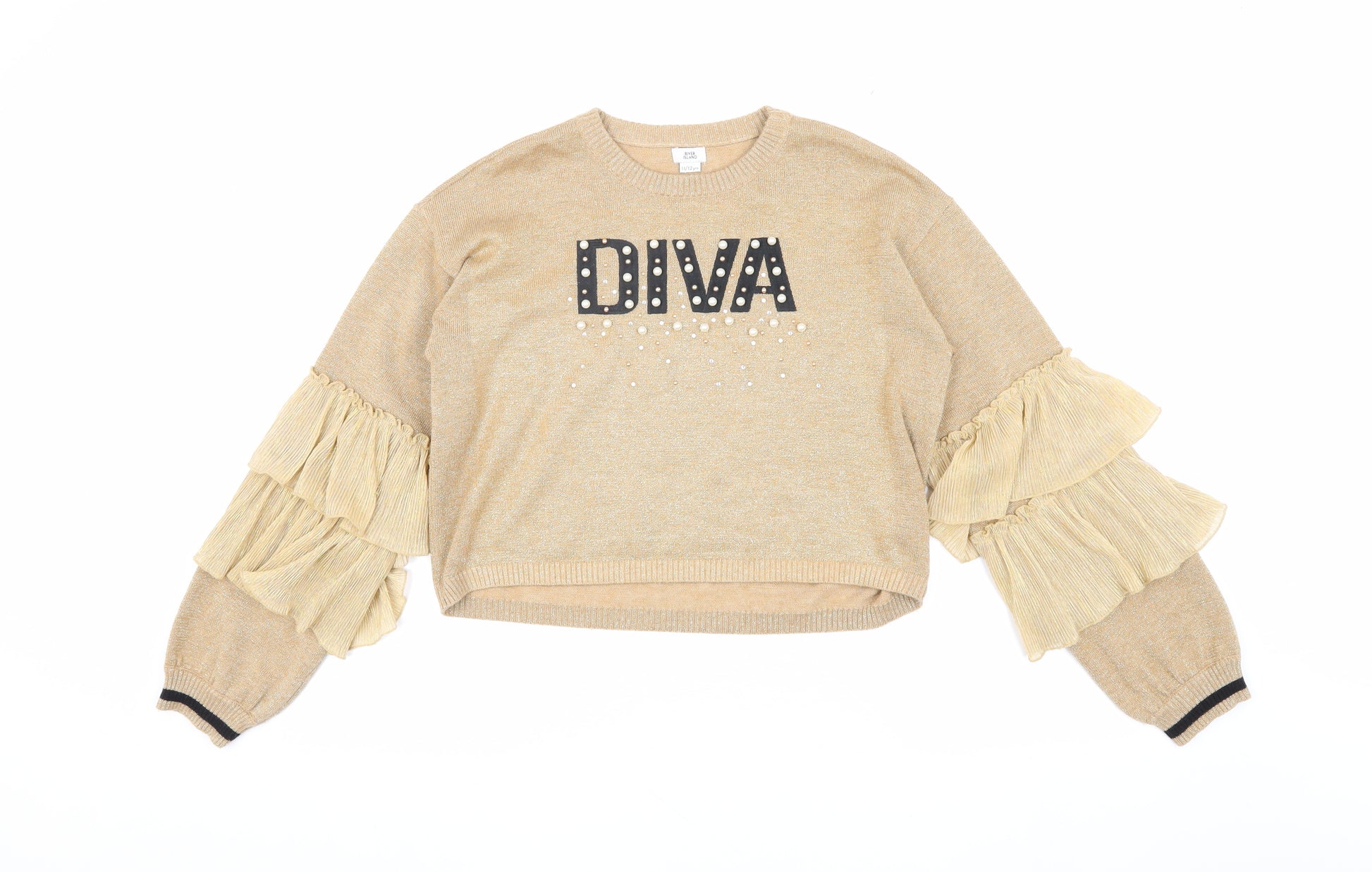 Elevate your young one's wardrobe with this stylish and chic River Island pullover jumper, designed specifically for girls aged 11-12 years. The elegant beige knit fabric is tastefully adorned with eye-catching embroidered 'DIVA' lettering, enhanced by sparkling glitter and delicate ruffle accents on the sleeves that add a playful flair. Perfect for casual outings or festive parties, this versatile piece is lightweight and lined for comfort, making it an ideal choice for both autumn and winter seasons. The long sleeves and crew neck design enhance warmth while ensuring ease of layering under jackets or coats. Crafted from a quality blend of nylon and metallic fibre, this jumper not only promises durability but also offers a subtle sheen that catches the eye. Machine washable for easy care, it’s a hassle-free addition to her wardrobe. Whether paired with jeans for a relaxed look or dressed up with a skirt for special occasions, this jumper is sure to become a favourite pick. Though in excellent condition, without original tags, it’s ready to deliver comfort and style to your young fashionista season after season.