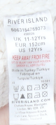 Keep your young fashion fan cosy and stylish in this beautiful River Island Girls ivory knit jumper, designed for ages 11-12 years. This comfortable pullover showcases a delicate open-knit pattern with subtle beaded accents, adding a playful yet elegant touch. Crafted from a soft blend of 90% acrylic, 6% polyester, and 4% polyamide, the material feels warm yet lightweight, perfect for keeping comfortable through colder months. The crew neckline and ribbed cuffs give it a classic shape, while the soft knitted texture offers warmth without heaviness, making it ideal for layering over shirts or wearing on its own during Autumn and Winter seasons. Designed for both comfort and ease, this jumper is a great choice for casual outings, school days, or family gatherings. Its neutral ivory tone makes it versatile for pairing with skirts, jeans, or leggings, offering a fresh and polished look. The pullover closure ensures quick styling with no fuss, while the durable knit helps maintain shape after washing. Easy to care for, simply hand wash or clean as per the care label to keep it looking fresh and new. Whether dressing up for a special event or layering for warmth, this River Island jumper embodies both fashion and practicality. The exquisite detailing in the knit pattern catches the light subtly, creating a textured finish that elevates everyday outfits. A perfect balance between playful design and refined craftsmanship, this piece is a wardrobe staple every girl will adore — dependable, stylish, and made to last. Add this chic piece to her collection today for a warm, trendy, and effortlessly cool look perfect for all her winter adventures.