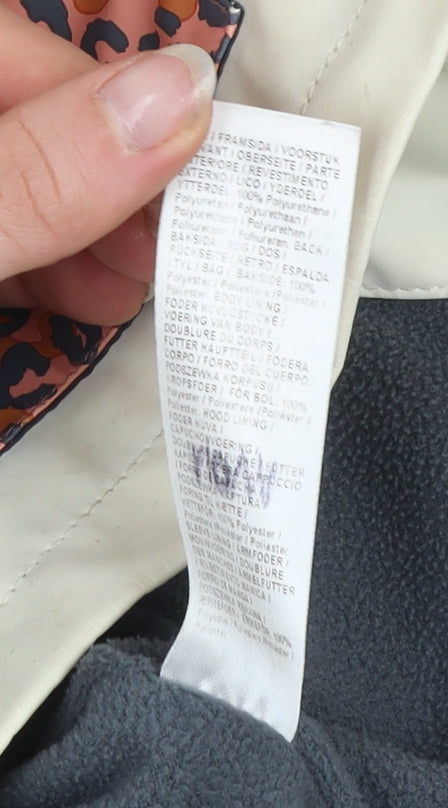 Keep your little one stylishly protected from the rain with this adorable River Island girls' hooded rain coat. Designed in a trendy pink leopard print with contrasting beige panels, this mid-length coat merges playful design with practical functionality. Crafted from a durable and water-resistant polyurethane outer shell, it’s ideal for those unpredictable autumn and spring days when light showers might appear. The coat has two front pockets with button flaps perfect for small treasures, and a secure button-through closure to keep out the chill. Inside, the soft polyester lining ensures comfort and warmth while maintaining breathability. The hooded design provides extra protection, making this coat both fashionable and functional for day-to-day wear. Perfect for trips to school, walks in the park, or casual outdoor adventures, it delivers excellent coverage and an eye-catching look. Finished with animal print detailing that is sure to stand out, it reflects River Island’s signature stylish flair. This coat shows minor signs of wear on the beige sections but remains in good overall condition, ready for plenty more rainy-day fun. Pair it with jeans, leggings, or casual trousers and wellies for an outfit that balances fun, fashion, and practicality. A must-have outerwear piece for any young trendsetter’s wardrobe – ideal for transitional weather, offering both charm and protection.