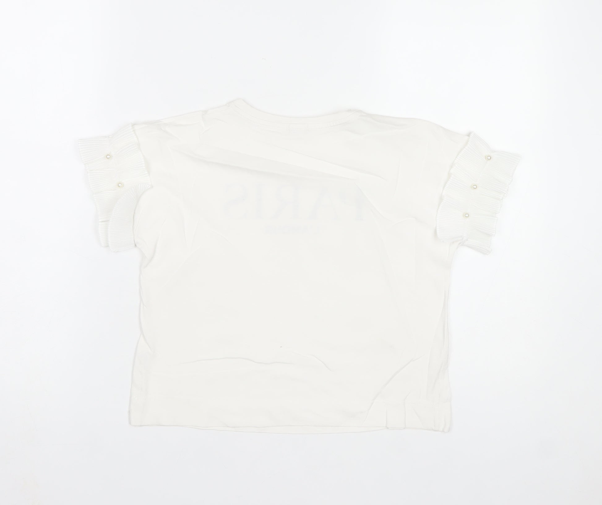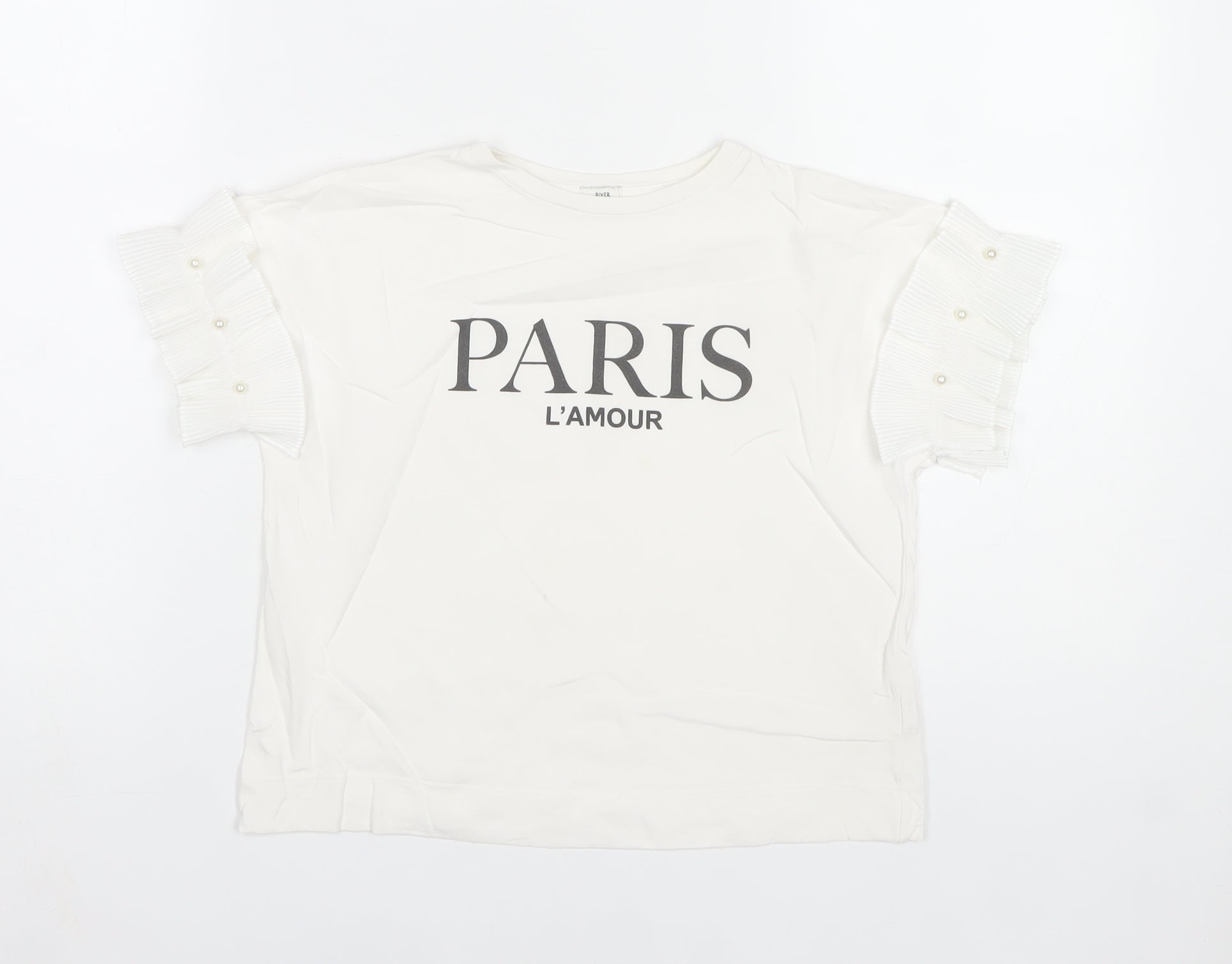 Add a touch of Parisian charm to her wardrobe with this stylish white 'Paris L'Amour' T-shirt from River Island. Designed for girls aged 7-8 years, this soft and breathable tee is crafted from high-quality 100% cotton, ensuring maximum comfort throughout the day. The smooth jersey fabric is gentle on the skin and ideal for everyday wear, from relaxed weekends to fun outings with friends. This T-shirt features a chic graphic print reading 'PARIS L'AMOUR' across the front in bold, contrasting text, offering a fashionable statement that’s effortlessly elegant. The pretty short sleeves are finished with pleated ruffled trims made from crisp white polyester, beautifully accented with small faux pearl buttons for an added touch of sophistication. Its regular fit and crew neckline make it easy to pair with jeans, leggings, or skirts for a versatile look. Perfect for spring and summer seasons, the lightweight and breathable design keeps her cool and comfortable on warm days. The T-shirt is suitable for both casual and party occasions, bringing a playful yet stylish aesthetic to her outfit. Practical and easy to care for, it’s fully machine washable, maintaining its shape and detailing wash after wash. In excellent pre-owned condition with no marks or flaws, this River Island girls’ tee is a chic addition to any young fashion lover’s collection. Ideal for gifting or refreshing her casual wardrobe, it combines comfort, quality, and a fashionable Parisian flair. Give her outfit a little extra sparkle and style with this lovely River Island 'Paris L’Amour' White Graphic T-Shirt – the perfect blend of modern simplicity and cute detailing.