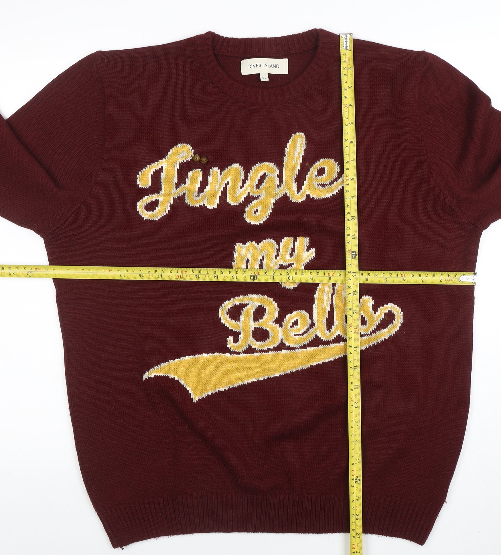 Get into the festive spirit with this River Island men’s Christmas jumper in a rich red tone that's ideal for the winter months. Crafted from soft 100% acrylic knit, it offers warmth and lasting comfort, making it a superb choice for casual occasions and seasonal gatherings. The jumper features a bold 'Jingle My Bells' graphic in contrasting gold lettering and includes small decorative bells that add a fun, playful touch. The crew neckline, long sleeves, and ribbed hems provide a classic look and snug fit. Designed in a regular fit, this pullover offers easy wear layered over shirts or on its own for a relaxed festive style. Lightweight yet cosy, it’s machine washable for easy care, ensuring you stay looking fresh throughout the celebration season. Perfect for office Christmas parties, family gatherings, or a novelty winter wardrobe addition, this jumper balances humour with fashion-forward design. Whether you’re gifting it or treating yourself, it’s sure to bring a smile to every room you enter. In very good pre-owned condition with minimal signs of gentle use, it shows no visible flaws or damage. Pair it effortlessly with jeans, chinos, or casual trousers for a cheerful yet stylish outfit. Celebrate the holidays the fun way with this eye-catching and comfortable River Island festive jumper – a wardrobe must-have for anyone looking to stand out during the season of joy.