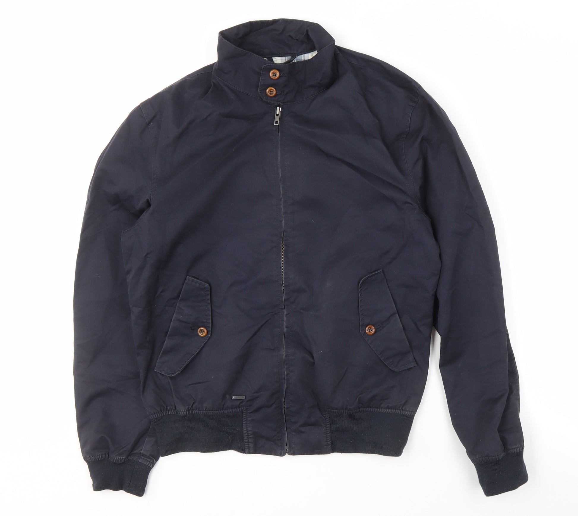Enhance your wardrobe with this stylish River Island bomber jacket, perfect for the modern man. Crafted with care, this standout piece features a 100% cotton outer shell, ensuring comfort and breathability. Its classic blue shade adds a versatile, trendy touch to any outfit, making it perfect for casual occasions throughout autumn and spring. The jacket sports a sophisticated stand-up collar, enhancing its bomber style, while the full zip and button closure add practicality and flair. Designed for men, it comes in a medium size, fitting regular body types comfortably. With handy pockets for convenience and a lining made from polyester and cotton, this jacket is as functional as it is fashionable. Pair it with jeans or chinos for a relaxed, polished look. This River Island piece is machine washable, making it easy to care for, so you can enjoy its style and comfort season after season. In excellent pre-loved condition, with no damage, it's priced attractively for budget-conscious buyers. A perfect blend of style and comfort, this jacket is a must-have addition to any man's collection.