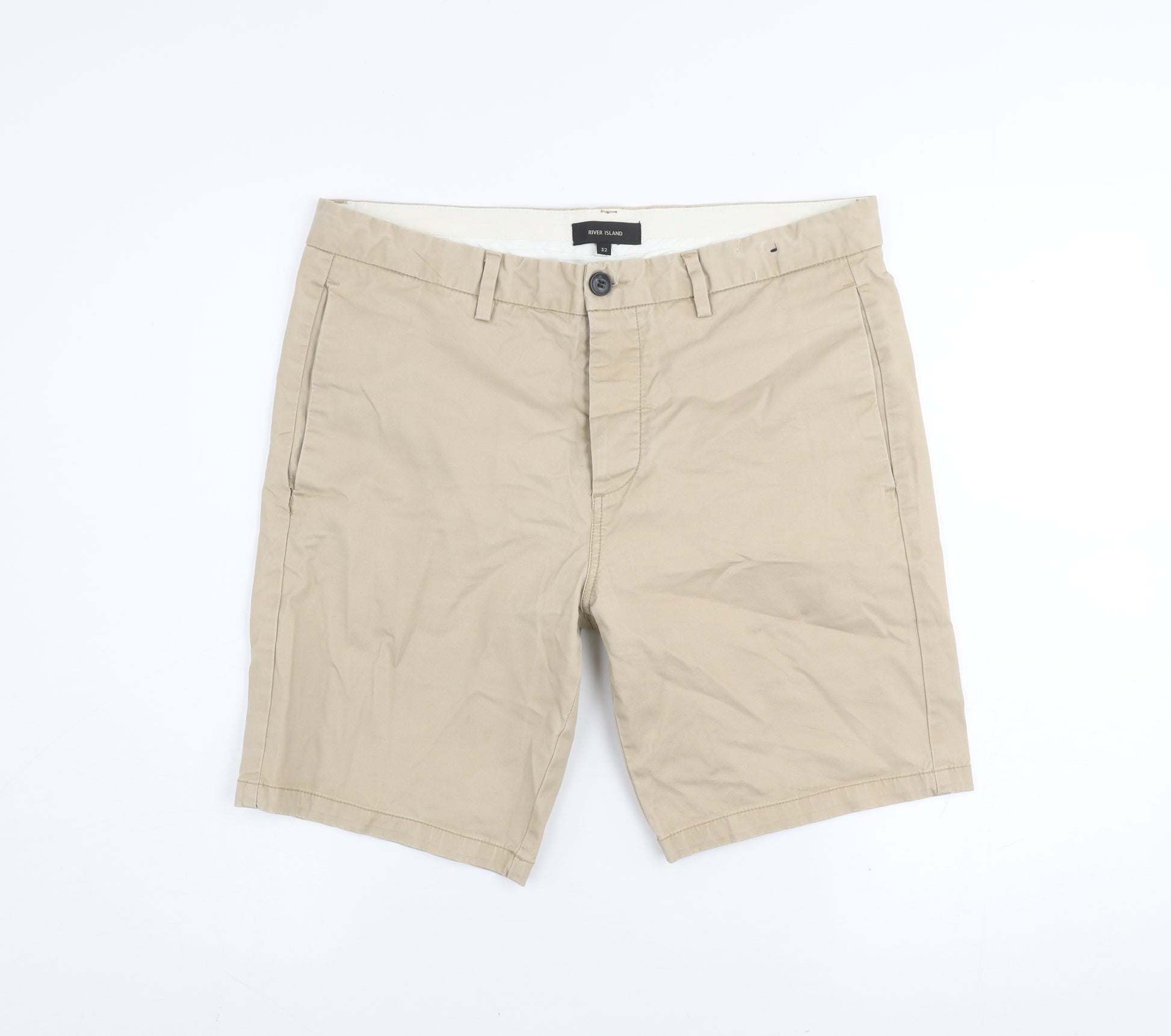 Step into timeless smart-casual style with these River Island men’s beige chino shorts in size 32. Crafted from a high-quality blend of 97% cotton and 3% elastane, these shorts deliver a comfortable yet refined look, perfect for everyday wear during the warmer seasons. The soft cotton offers breathability and durability, while a touch of elastane ensures flexibility and ease of movement for all-day comfort. Featuring a flat front design and classic slash pockets, these chinos capture a clean and tailored silhouette suitable for a relaxed summer outing, weekend stroll, or casual get-together. The light beige shade offers effortless pairing with everything from crisp white shirts to relaxed polos, making them an essential wardrobe staple for versatile styling. They are finished with a secure button and zip closure and have belt loops for easy accessory coordination. These shorts reflect the quality and stylish appeal associated with River Island—a brand known for producing fashion-forward yet wearable pieces. With their neatly stitched seams and well-proportioned fit, these chino shorts flatter the frame while maintaining a relaxed and timeless aesthetic. Ideal for spring and summer wear, they offer a breathable and lightweight feel that transitions easily from day to evening. In excellent pre-owned condition, showing only light signs of previous wear, these shorts remain fresh and ready to wear. Their crisp beige colour and clean cut make them an excellent choice for holidays, casual outings, or smart-casual office looks. Machine washable for easy care, they combine practicality and minimalist design perfectly. For the man who values quality, comfort, and understated sophistication, these River Island beige chino shorts are a perfect seasonal essential that will complement any wardrobe effortlessly.