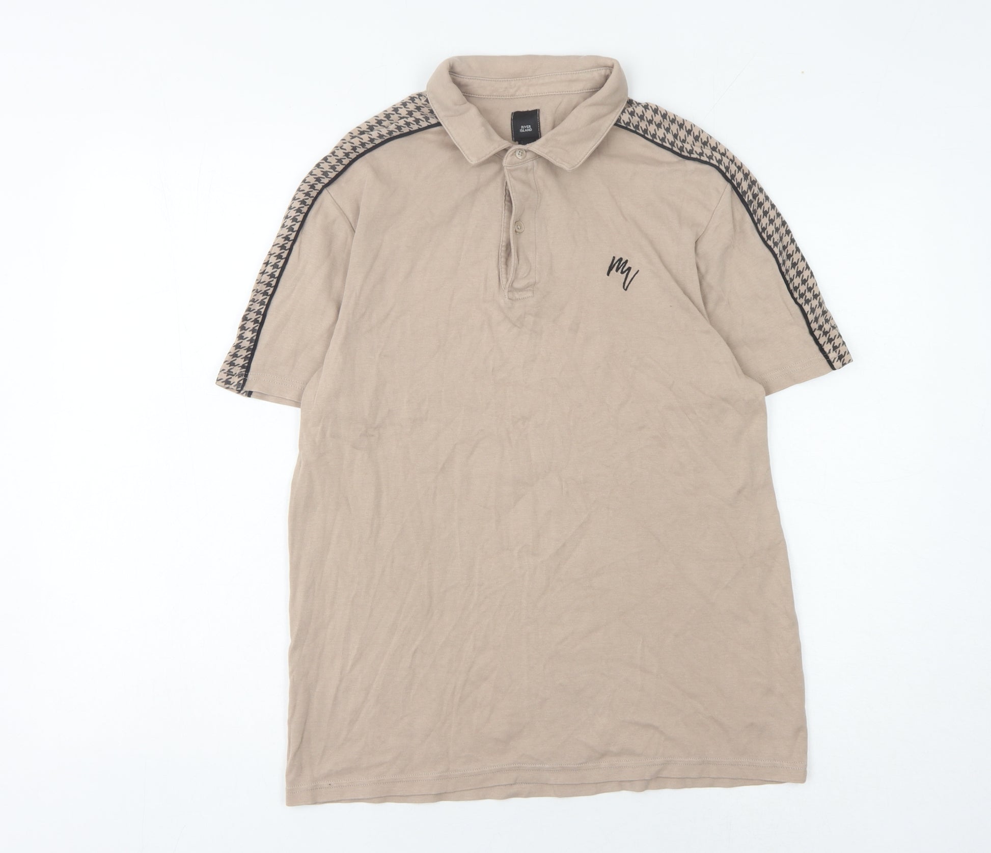 Elevate your casual wardrobe with this stylish men's beige polo shirt from River Island. Crafted for comfort and style, this medium-sized shirt is perfect for a variety of relaxed occasions. The shirt features a classic collared neckline and short sleeves, making it an ideal choice for summer outings. The subtle houndstooth pattern across the shoulders adds a touch of sophistication and uniqueness to the overall design, distinguishing it from conventional polos.Made from 100% cotton, this polo promises breathability and comfort throughout the day. Whether you're heading for a casual meetup, a laid-back lunch, or just running errands, this shirt ensures you stay stylish effortlessly. The easy-care fabric allows for machine washing, making it convenient to maintain.Although gently worn, this polo remains in excellent condition with no noticeable signs of wear or damage. Priced affordably, this versatile polo shirt is a valuable addition to any man's closet, offering a blend of style, comfort, and durability. Transform your everyday look with this essential piece that's both practical and fashionable.