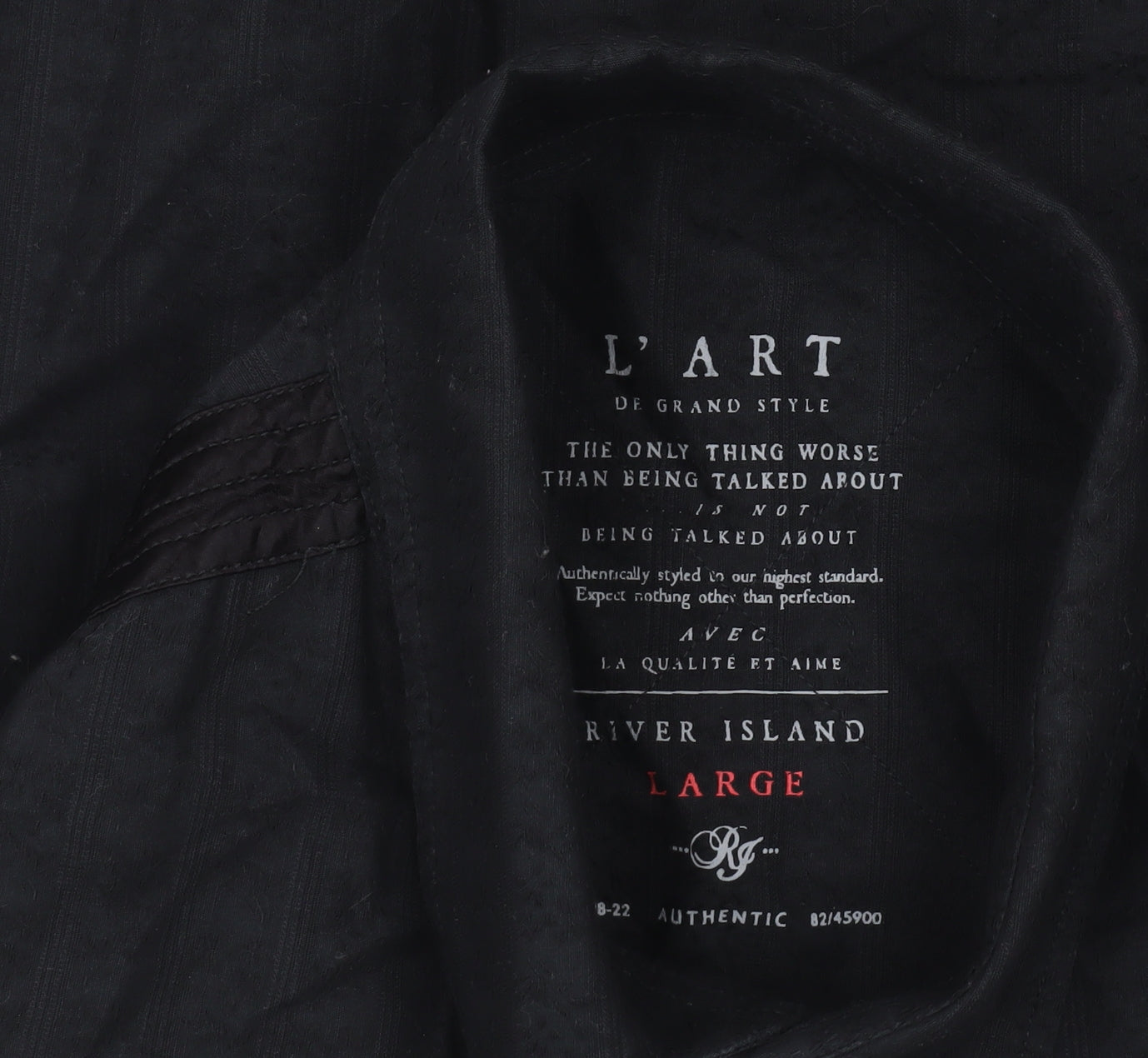 This River Island men's black dress shirt offers a timeless and versatile style perfect for a range of occasions, whether you're attending a wedding, formal event, or simply elevating a smart-casual look. Crafted from 100% cotton, the shirt is breathable and lightweight, ensuring comfort throughout the day. Designed with a regular fit, long sleeves, and a classic pointed collar, it provides a flattering silhouette while maintaining a polished appearance. The shirt features a solid black colour with button fastenings down the front, exuding understated elegance suitable for both business and social environments. It is equipped with barrel cuffs for a refined detail that enhances its formal essence. This shirt can be easily styled with tailored trousers and a blazer for a formal look, or dressed down with chinos or jeans for a modern party or evening outfit. Its versatile character makes it an excellent wardrobe staple, providing both sophistication and adaptability. The woven cotton fabric offers durability yet remains soft to the touch, keeping you comfortable without sacrificing sharp style. Condition is very good, with only light creasing visible from storage but no significant flaws, marks, or damage, ensuring this piece is ready to wear and impress. Machine washable for easy care, it delivers practicality alongside its refined look. Suitable for weddings, parties, formal dinners, or business occasions, this River Island shirt captures a balance of everyday usability and elevated style. An ideal option for men seeking a versatile and stylish shirt that transitions seamlessly between smart and relaxed settings, this garment ensures confidence and sophistication no matter the event. Whether as a wardrobe staple or a statement piece for evening wear, this shirt is a reliable choice that embodies both elegance and comfort.