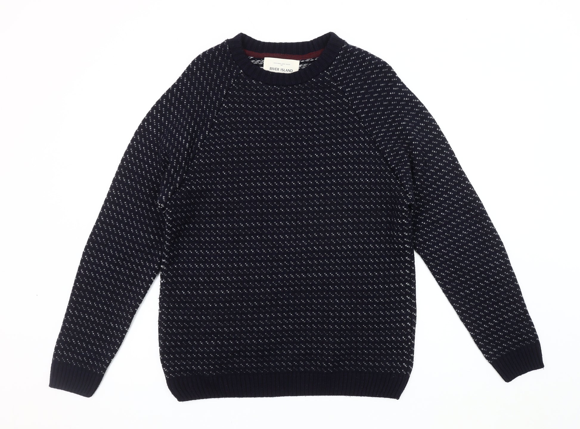 Upgrade your wardrobe with this River Island Men’s Pullover Jumper, perfect for the cooler months. Crafted from a high-quality blend of 85% Acrylic and 15% Polyester, this jumper promises both warmth and comfort. The jumper's tight-knit construction ensures durability, making it a reliable addition to your casual wear collection. Its deep blue tone, accented with a subtle graphic print pattern, adds a fashionable touch to any outfit. The crew neck line offers a classic look, while the long sleeves provide ample warmth. Notably, this jumper features stylish button accents on the elbow patches, combining functionality with aesthetic appeal.Ideal for autumn and winter, this regular fit jumper aligns seamlessly with your seasonal wardrobe. Its casual style makes it versatile for a range of occasions, from laid-back weekends to informal gatherings. Easy to maintain, this garment is machine washable, ensuring that it stays in great condition with minimal effort. The jumper is brand new, in excellent condition, and shows no signs of wear, making it a fantastic investment piece for your closet.Don't miss out on this opportunity to add a touch of River Island's contemporary style to your look. Whether paired with your favorite jeans for a relaxed look or layered under a jacket for added warmth, this jumper promises to be a go-to choice throughout the colder months. It’s not just a piece of clothing; it’s your new favorite go-to for comfort and class.