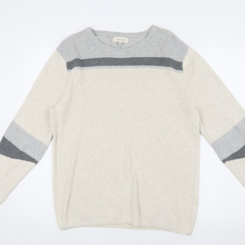 Discover the perfect blend of style and comfort with this River Island Men's Jumper. Crafted from a luxurious 95% cotton and 5% cashmere blend, this ivory pullover promises a soft and warm experience, ideal for those chilly autumn and winter days. Its crew neck design combined with a tight-knit structure adds a touch of sophistication to your casual wardrobe. Durable and machine washable, this jumper stands out with its minimalistic, no-pattern look, making it versatile for various casual occasions. Perfect for the modern man, pair it with jeans for a relaxed day out or layer under a coat for added warmth. Slight signs of use are present, but it remains in excellent condition. Upgrade your seasonal collection today.