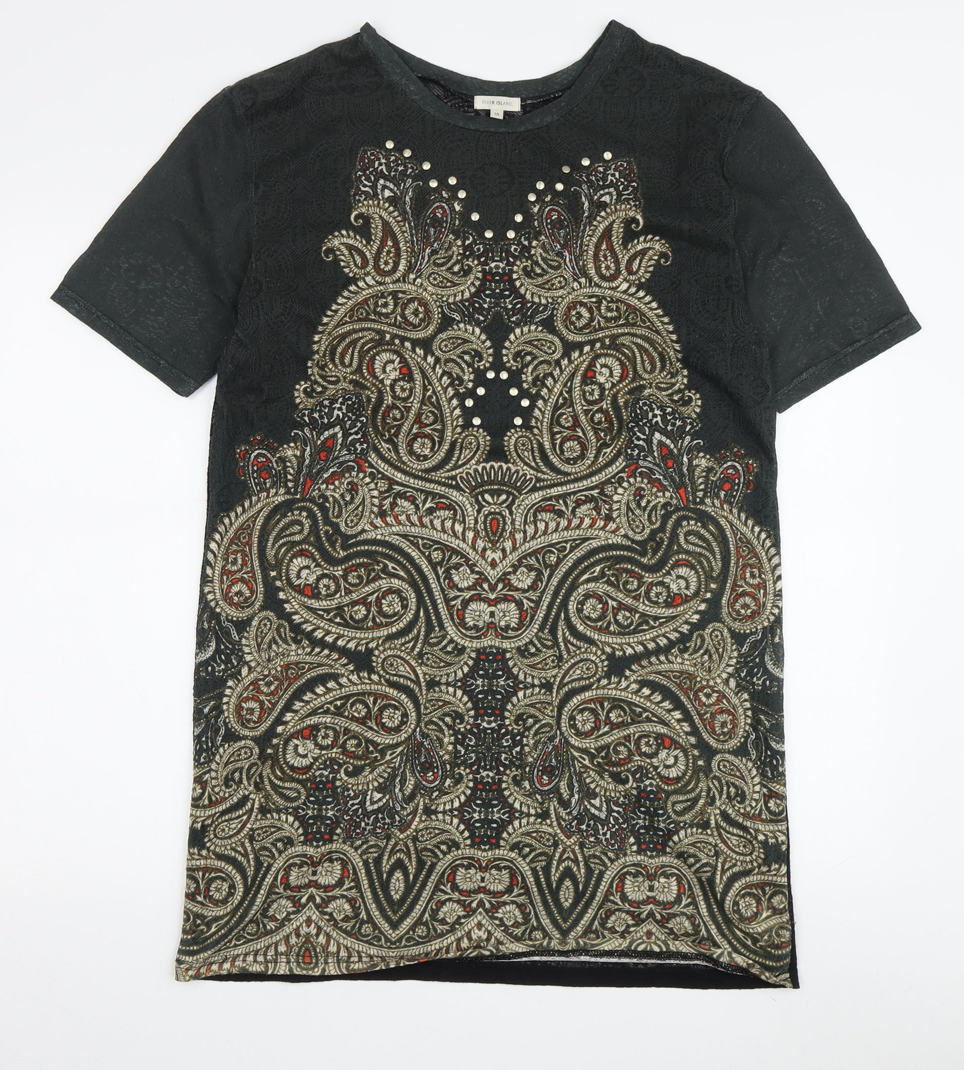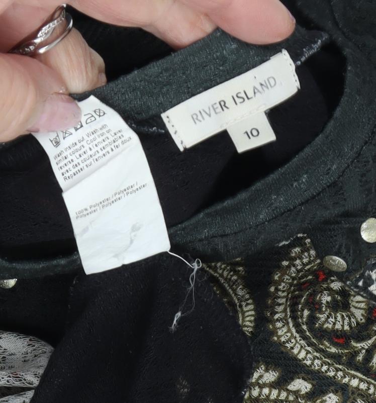This stunning River Island women's dress combines versatile elegance with a unique paisley pattern, perfect for adding a touch of sophistication to any wardrobe. Crafted from comfortable polyester jersey fabric, this short sleeve shift dress offers a flattering fit that seamlessly blends comfort and style. The black colour palette serves as a classic backdrop for the intricate design, ensuring wearability through various occasions, whether it's for casual outings or more refined settings. Featuring a round neckline, it maintains a timeless silhouette adaptable for different styling preferences. Despite minimal signs of wear, the dress remains in excellent condition, offering incredible value for stylish seekers. Pair it with your favourite heels or flats for an effortlessly chic look. Ideal for women who appreciate both comfort and fashion, this piece is a must-have addition to your stylish wardrobe, promising versatile wearability and elegant flair.