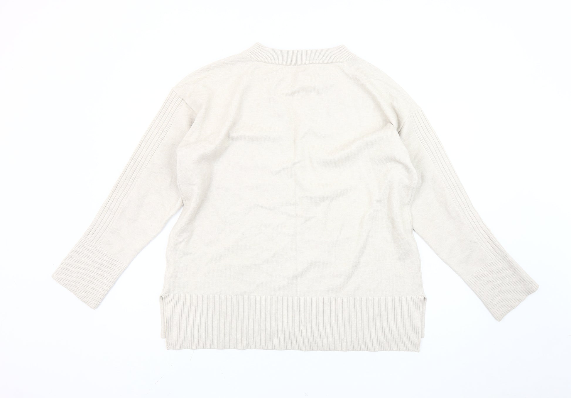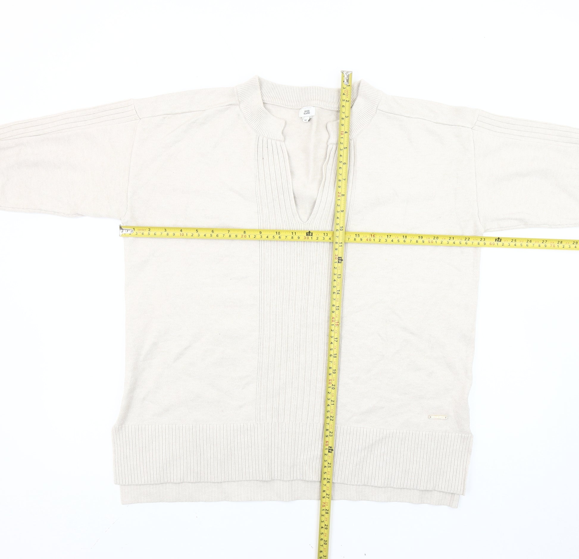 Elevate your casual wardrobe with this stylish River Island women’s pullover jumper in a versatile beige hue. Designed with a flattering V-neckline and distinctive ribbed detailing along the neckline, cuffs, and hem, this piece is perfect for layering or wearing on its own. The mid-weight knit is crafted from a comfortable and breathable cotton-polyester blend, making it an excellent choice for transitional weather and cooler days. With its regular fit and raglan 3/4 sleeves, this jumper offers both comfort and ease of movement while maintaining a sleek silhouette. The neutral beige tone adds a timeless touch, making it an easy match with jeans, trousers, or skirts for various occasions. Whether you are dressing for a relaxed weekend outing, a smart-casual workday, or simply lounging in comfort, this jumper effortlessly adapts to your needs. Durable yet soft to the touch, the knit fabric feels gentle on the skin while holding its shape through repeated wear. Machine washable for easy care, it’s a practical addition to your everyday wardrobe. The lack of bold patterns ensures a clean, minimal look, allowing you to accessorise freely or keep it understated and elegant.In excellent pre-owned condition with only light signs of wear, this River Island jumper is ready to bring style and versatility to your collection. Pair it with denim for an effortless casual look, or match with tailored trousers for a polished approach. Perfect for autumn, spring, and even layering in winter, it is a reliable piece you'll reach for again and again.Add this chic, neutral-toned essential to your wardrobe and enjoy a blend of comfort, style, and long-lasting quality from a brand you can trust.