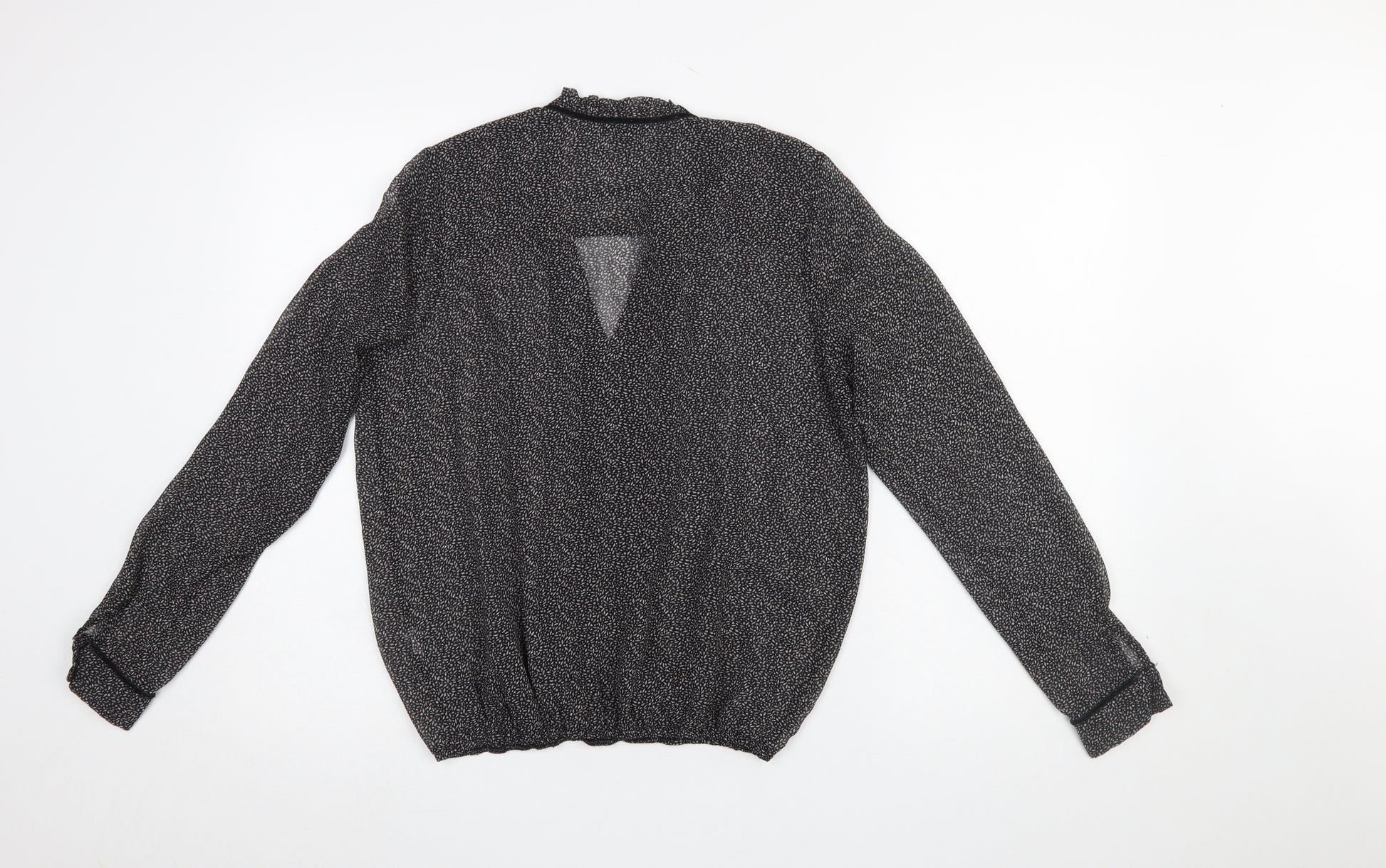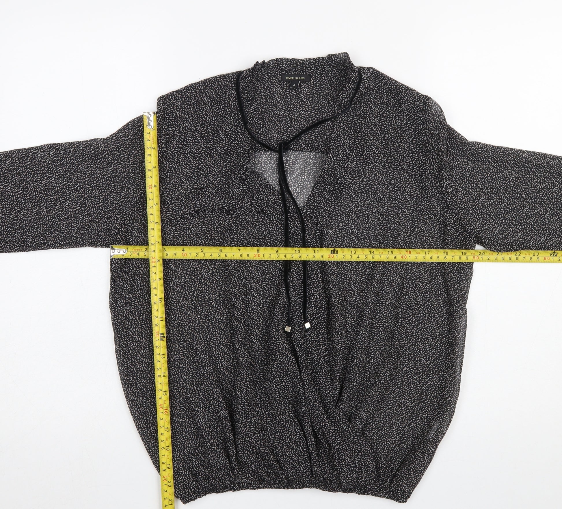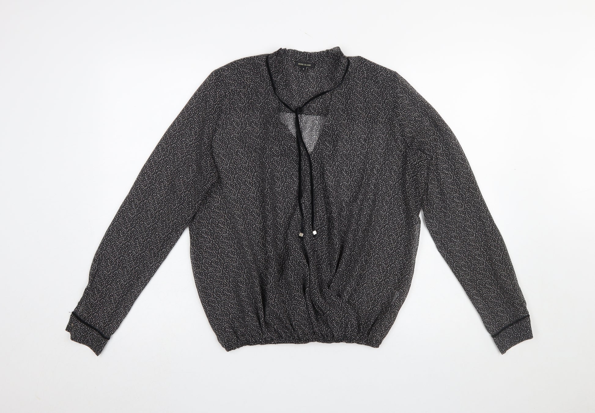 This elegant River Island women’s blouse is a perfect addition to your wardrobe, combining comfort and style effortlessly. Designed in a flattering regular fit, this tunic-style top features a sophisticated V-neckline with tie detail, adding a touch of effortless charm. The lightweight chiffon fabric, crafted from soft 100% polyester, offers a breathable and airy feel, perfect for both workwear and casual outings. Its long fitted sleeves and elasticated hem give the blouse a comfortable drape that suits many body shapes. The black base adorned with a subtle floral micro-pattern gives the blouse a refined yet versatile appearance, pairing beautifully with tailored trousers, jeans, or skirts. Ideal for the transitional seasons of spring and autumn, this blouse complements layered looks, making it suitable for both cooler mornings and warmer afternoons. Engineered for easy care, it’s machine washable and designed to retain its silky texture after every wash. This top can easily be styled for different occasions – from smart-casual office wear to evening social gatherings. The tie closure at the neckline adds a customisable touch, allowing you to wear it open for a relaxed look or tied for a polished finish. Breathable and wrinkle-resistant, it’s also a great choice for everyday wear or travel. Conditioned in excellent pre-loved state with no visible marks or damage, this top looks great and maintains its shape. River Island’s chic design aesthetic and attention to detail make it a timeless piece suitable for a modern woman’s wardrobe. Whether you aim for an elegant workday ensemble or an effortlessly classy weekend look, this blouse delivers versatility and refinement. Secure this stylish, lightweight, and easy-care River Island blouse to upgrade your collection with understated sophistication and dependable quality.