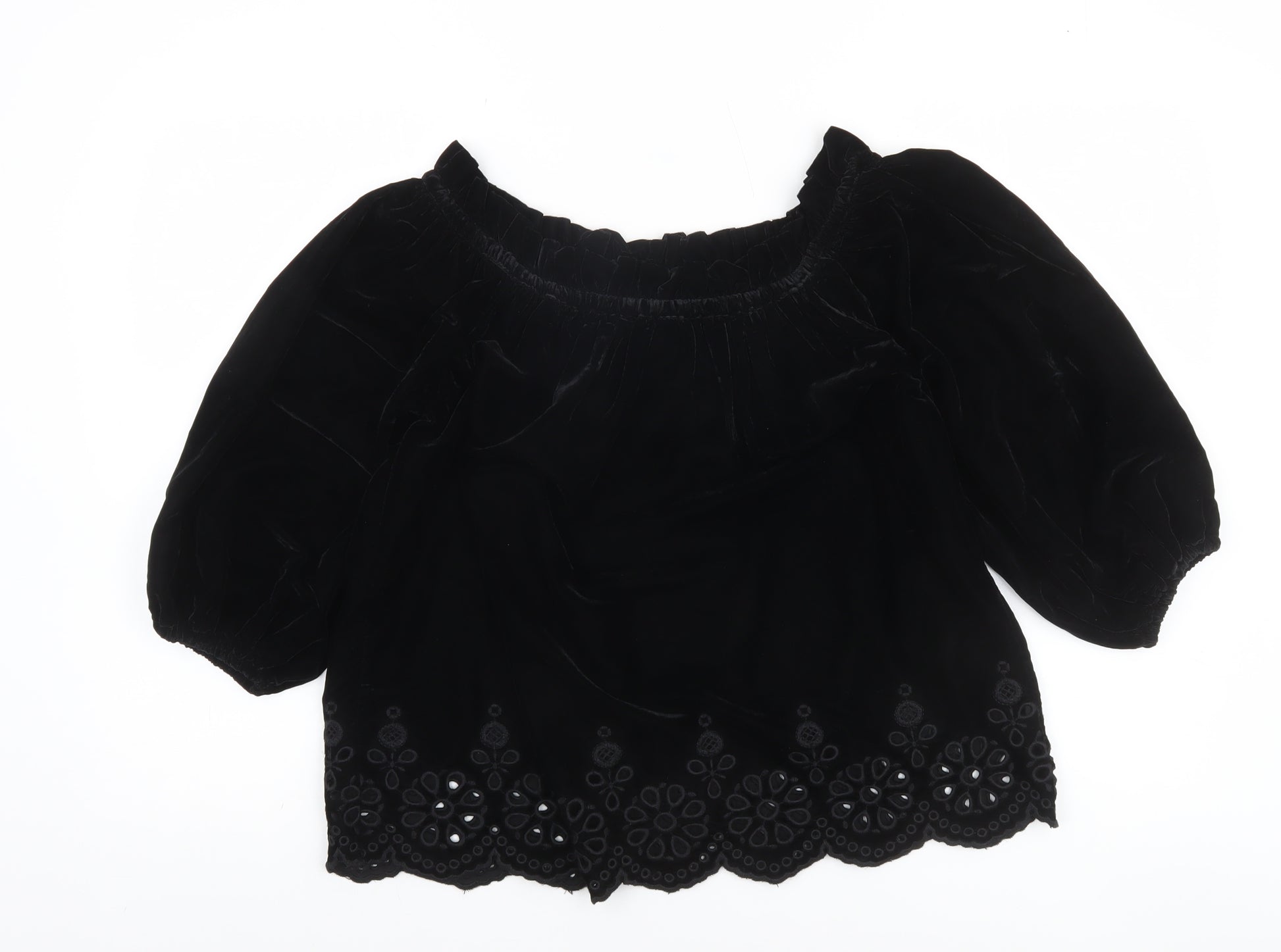 Elevate your wardrobe with this stunning River Island women’s black velvet off-the-shoulder blouse in UK size 10. Crafted from luxurious 100% polyester velvet, this stylish top combines a romantic peasant-inspired design with a contemporary edge. The off-the-shoulder neckline and elasticated edges ensure a flattering, comfortable fit that stays secure while maintaining soft movement. The rich black velvet fabric gives off a subtle sheen, perfect for both day and evening wear. The blouse features 3/4 length puff sleeves that add gentle volume and femininity, while the embroidered hemline with eyelet cut-out detailing provides an elegant finishing touch that sets it apart from basic tops.This blouse is ideal for pairing with slim-fit jeans or tailored trousers for a chic contrast in texture. It works beautifully for casual gatherings, dinner dates, or stylish party occasions. Designed in a regular fit for effortless wear, it offers breathable comfort despite its plush fabric. Machine washable and easy to maintain, this top is as practical as it is fashionable. The soft velvet finish makes it particularly suited to cooler months like autumn and winter but can also transition into spring when layered with lighter outerwear. Subtle details and high-quality construction make this piece a versatile wardrobe hero that exudes understated glamour. Whether you’re dressing for a night out or a smart-casual occasion, this timeless piece captures both elegance and wearability.In excellent pre-owned condition, this River Island blouse shows no signs of wear or any visible flaws, with its deep black velvet maintaining a rich texture and colour throughout. A perfect choice for those who love statement pieces with feminine charm, it offers a high-fashion look at a fraction of the cost of new. Add this gorgeous black velvet blouse to your collection for an instantly polished and effortlessly stylish outfit.
