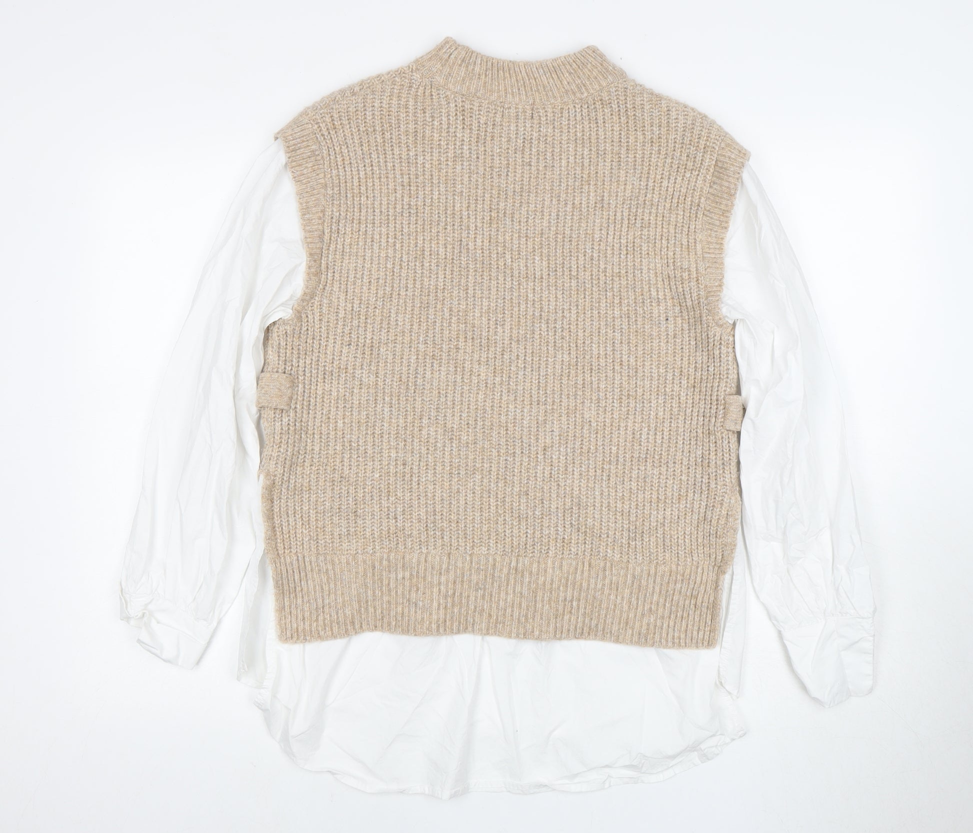 Embrace effortless winter chic with this River Island vest, perfect for layering over your favourite tops. The vest features a mock neck design and sleeveless style, making it an ideal choice for a casual day out or a cozy indoor gathering. Crafted in a stunning beige hue, the vest's tight-knit construction ensures warmth and a comfortable fit. Composed of a premium blend of materials including nylon, acrylic, wool, and alpaca, it promises a luxe feel against the skin. The heavyweight fabric is perfectly suited for the colder months, and its classic button accents add a touch of elegance. Suitable for a variety of occasions, this vest pairs seamlessly with jeans or a fitted skirt, offering both style and versatility. Whether you're sipping coffee at a café or taking a walk in the park, this River Island vest is a must-have addition to your winter wardrobe. Get ready to turn heads with this sophisticated piece that embodies comfort and fashion.