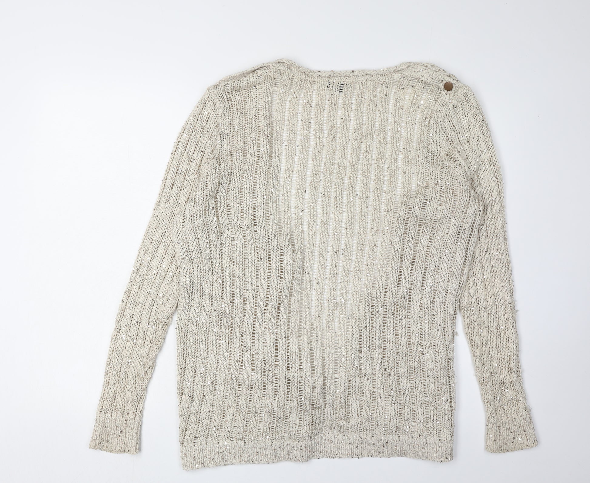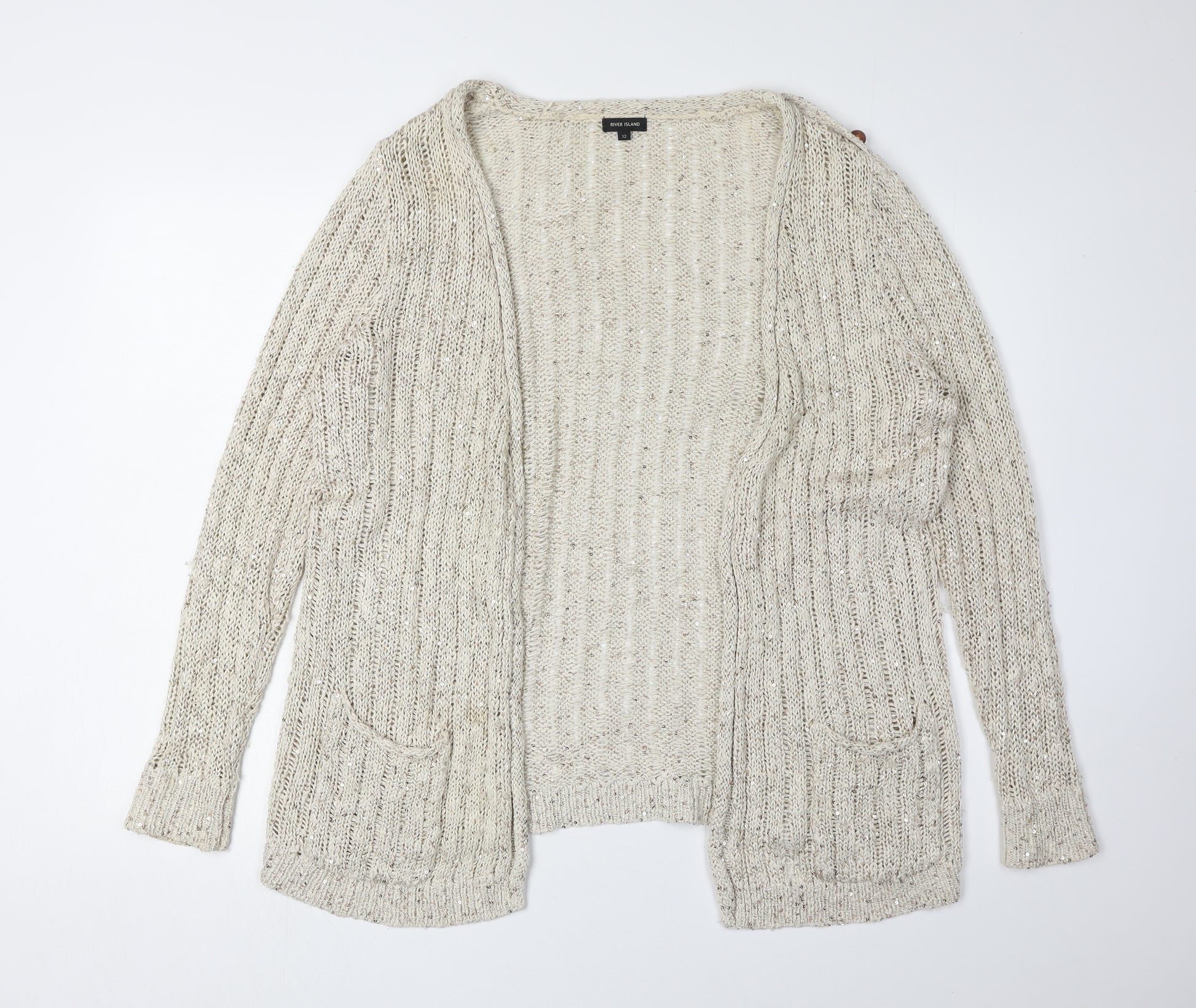 Embrace casual elegance with this River Island women's cardigan, perfect for adding a touch of sophistication to your wardrobe. Crafted in a soft beige hue, this long sleeve cardigan features an open-knit style that's both breathable and lightweight, making it ideal for layering during the cooler autumn and spring months. Accentuated with subtle sequins, this piece offers a hint of sparkle without overpowering your outfit, ensuring you stand out effortlessly.Designed for women seeking a relaxed fit, this cardigan is both stylish and comfortable. The blend of 60% cotton and 40% polyester promises durability and ease of care, recommended for hand washing only. The garment showcases an open design, allowing you to wear it over tops and dresses for a versatile look.Whether you're heading to a casual meet-up or simply lounging at home, this cardigan provides both warmth and style. The no-pattern design enhances its versatility, seamlessly blending with various looks. Sequins add an eye-catching element, making this cardigan suitable for day-to-night transitions, whether you're attending a brunch or a relaxed evening gathering.The River Island brand is synonymous with modern fashion and quality, and this cardigan is no exception. Its very good condition ensures that despite some light wear, all sequins remain intact, contributing to its charm and character. Elevate your everyday style with this elegantly crafted cardigan, designed to be a wardrobe staple for seasons to come.