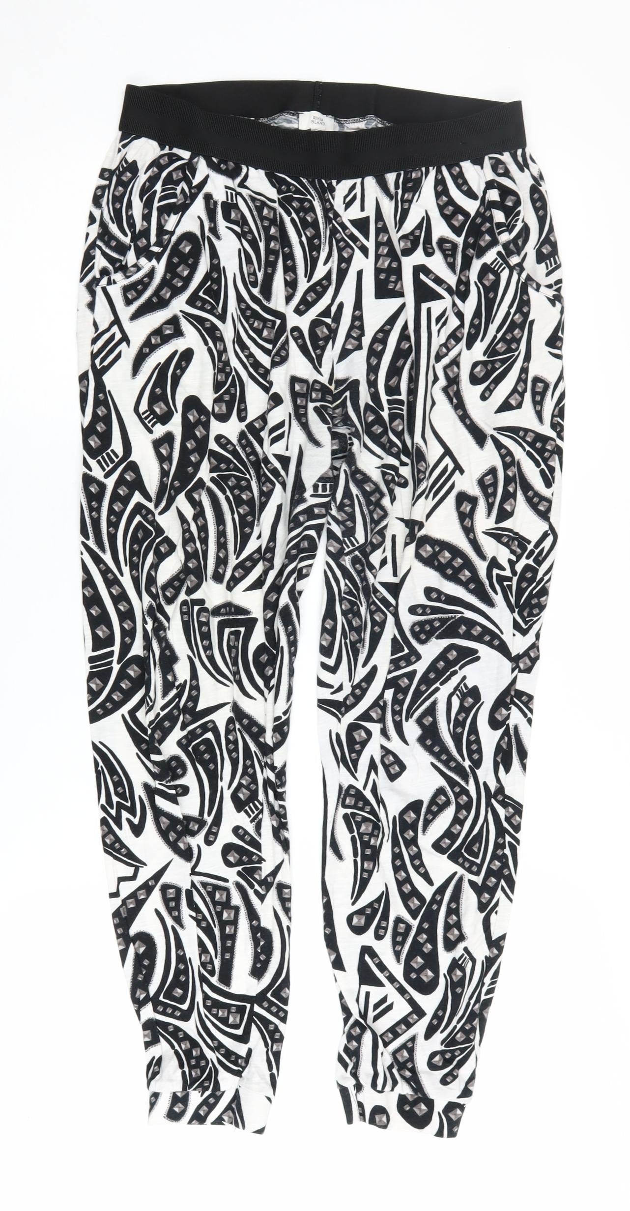 Elevate your casual wardrobe with these stylish River Island joggers, ideal for spring and summer outings. Tailored in a chic geometric pattern, these black and white trousers provide both comfort and fashion. Crafted from 100% cotton, they offer a breathable and lightweight feel. The joggers feature a convenient elastic waistband, ensuring a comfortable fit for everyday wear. With a regular fit and tapered leg style, they complement every casual occasion with a modern twist. Perfect for art-themed gatherings or just a relaxed day around town, these joggers will surely become a staple in your wardrobe. Machine washable for easy care, these joggers are in excellent condition, showcasing no visible signs of wear. Don’t miss out on these versatile and fashionable trousers. Grab them now and redefine your casual look!