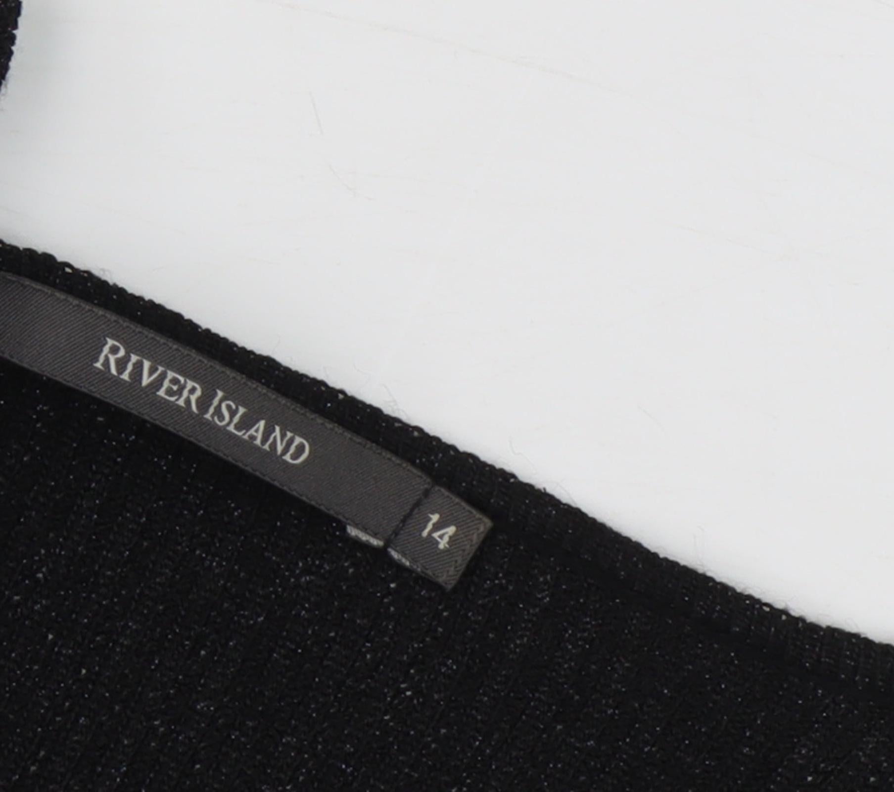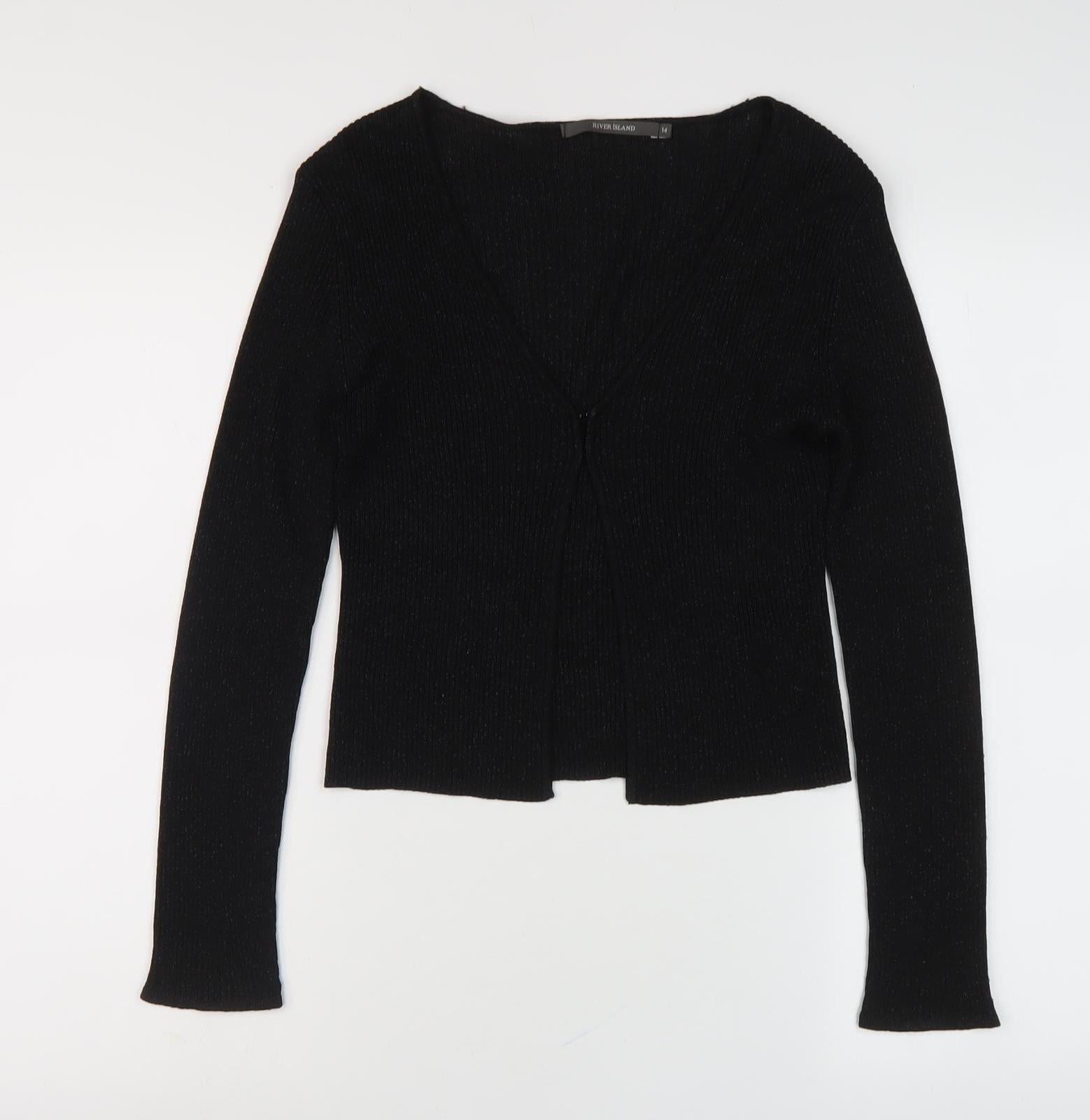 Introducing a timeless addition to your wardrobe with this elegant River Island cardigan, tailored specifically for women seeking style and comfort. This sleek black cardigan, in a size 14, fits smoothly in your smart-casual or formal collection with its sophisticated aesthetic. Crafted from a high-quality blend of viscose and polyester, this cardigan promises durability while maintaining a luxurious soft finish against your skin. Its simple, yet classic design allows for ease in pairing with any outfit, making it a versatile element in your fashion ensemble. Perfect for layering over your favourite blouse or dress, the cardigan gracefully enhances your look, whether it's a day at the office or a relaxed evening outing. Boasting a long sleeve length, it provides ample coverage for chillier days, keeping you warm and comfortable without compromising on style. With its sleek silhouette, this cardigan manages to offer a refined finish that complements your figure. Though it lacks additional accents, it shines in its minimalistic charm, aligning impeccably with a modern woman's fashion sensibilities. The piece categorises under the 'jumper' type, blending functionality with trend. Engineered to offer excellent quality, its no-pattern design summons a clean, uncluttered appearance, perfect for those who prefer a subtle and understated elegance. While tags may not be present, its pristine condition highlights careful preservation, suggesting it has been worn minimally. As a result, this piece emerges as an appealing option for purchase. This River Island cardigan – retailing attractively at £12.00 – encapsulates value for money with its prime condition and enduring style. Indulge yourself in the sophisticated simplicity of this cardigan to elevate your fashion repertoire effortlessly today.