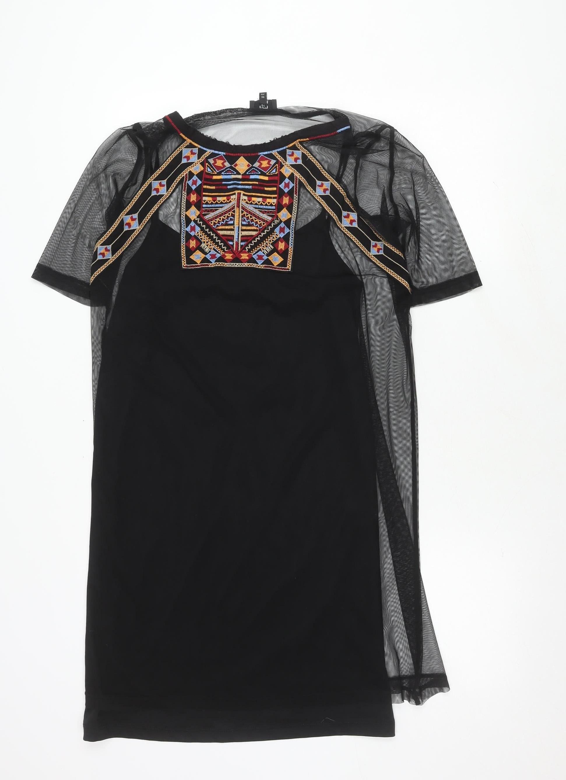 Step out in style with this striking River Island dress, featuring an elegant black mesh overlay and vibrant geometric embroidery. This piece, suitable for many occasions, is crafted from a blend of polyester and elastane, offering comfort with a touch of stretch. With its flattering silhouette tailored for women, it promises to complement any wardrobe. While this dress is in excellent condition, slight signs of use are present. Hand wash only to preserve its unique design and quality. Elevate your ensemble with this fashion-forward choice that's perfect for adding a chic touch to your look.