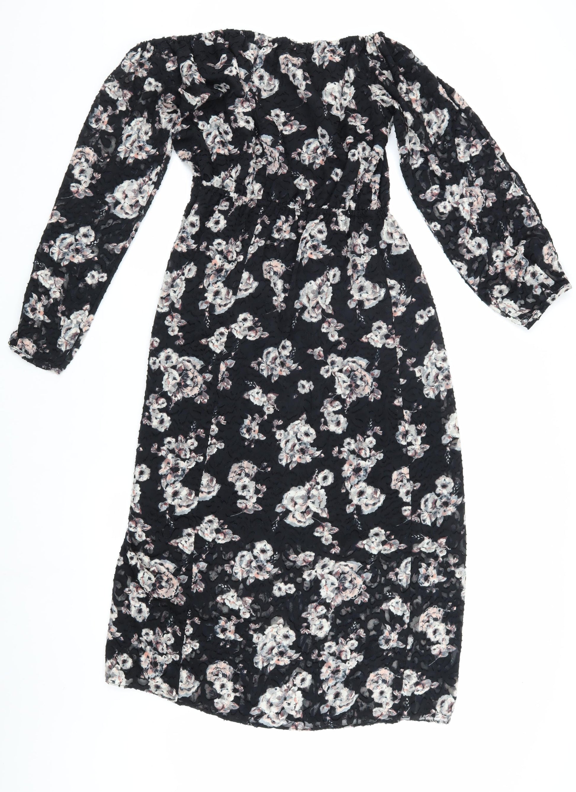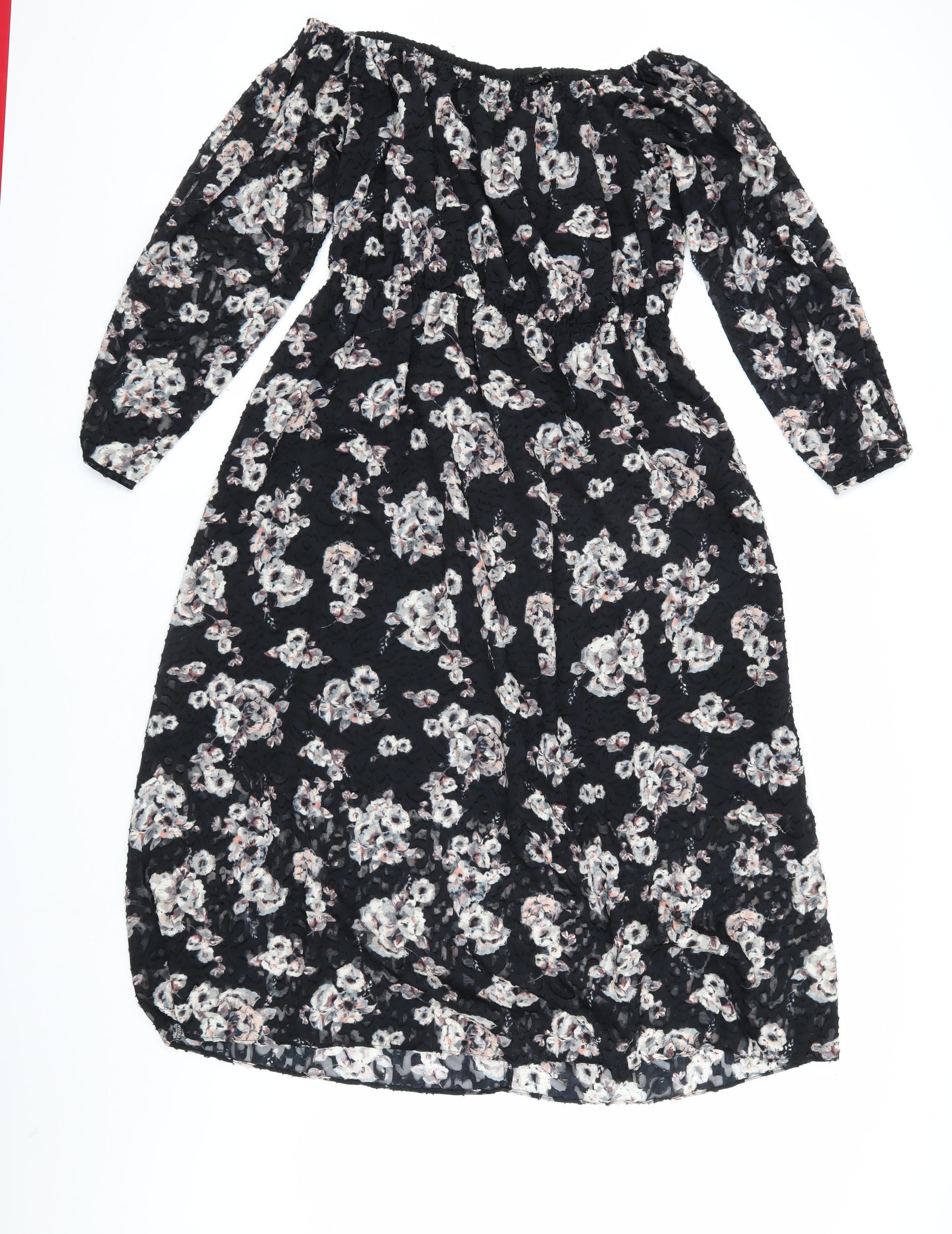 Step out in style with this beautiful black floral midi dress from River Island. Perfectly tailored for women, it features a delightful off-the-shoulder design that adds an element of elegance to your look. The charming floral pattern set against a black backdrop makes it a versatile choice for casual outings or gatherings. This dress boasts long sleeves making it a cosy pick for both spring and summer seasons. Crafted from 100% polyester, the fabric offers a comfortable and breathable wearing experience, while the smocked waist accentuates your silhouette effortlessly. Pair it with your favourite heels or casual sandals to create a chic ensemble. Maintaining this dress is a breeze as it’s machine washable. Secure this stylish addition to your wardrobe and make heads turn wherever you go. A must-have for those who love to blend simplicity with grace, this dress ensures you stand out with class.