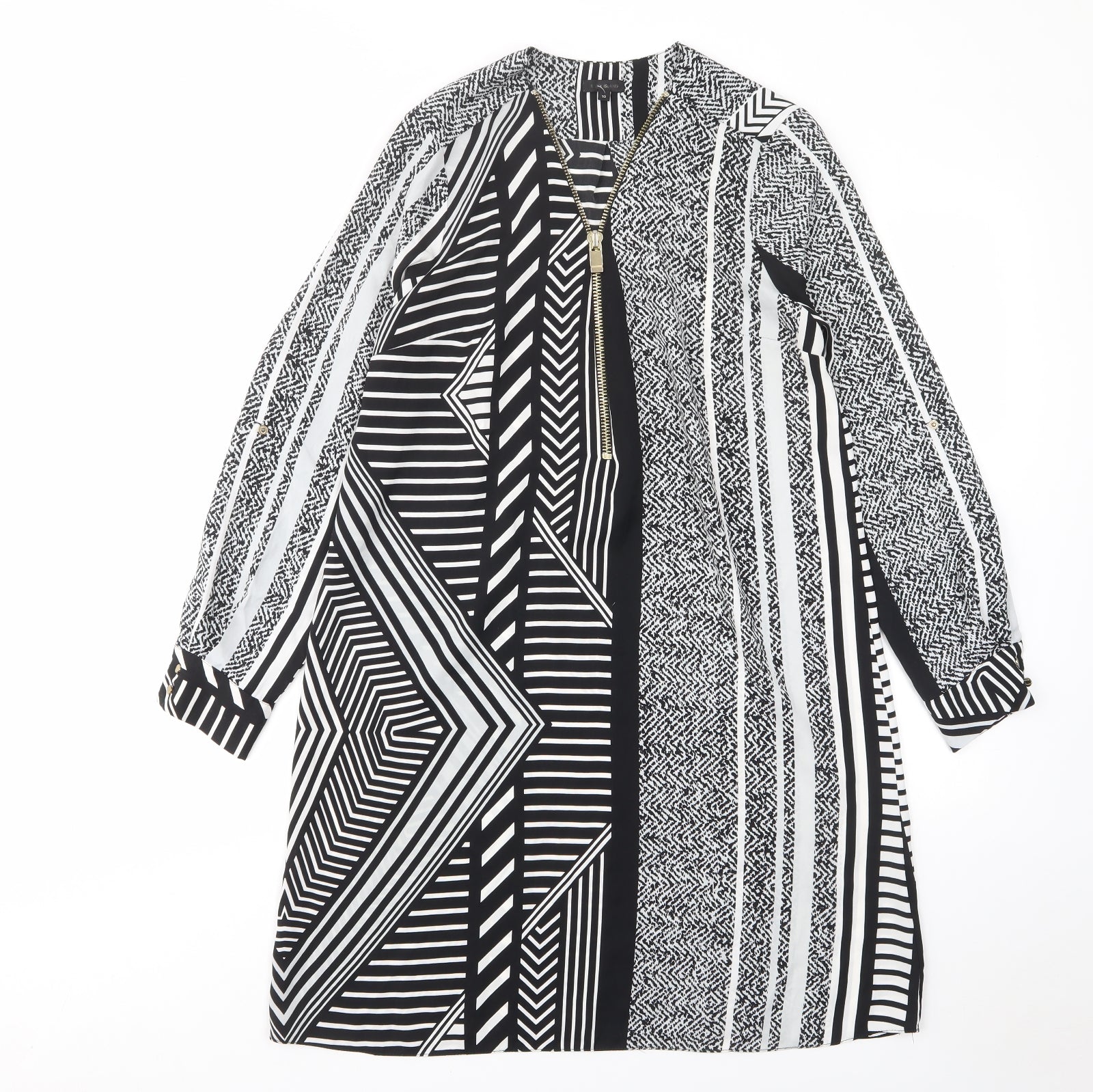 Womens Black Geometric Polyester A-Line Size 10 V-Neck Pullover - Zip