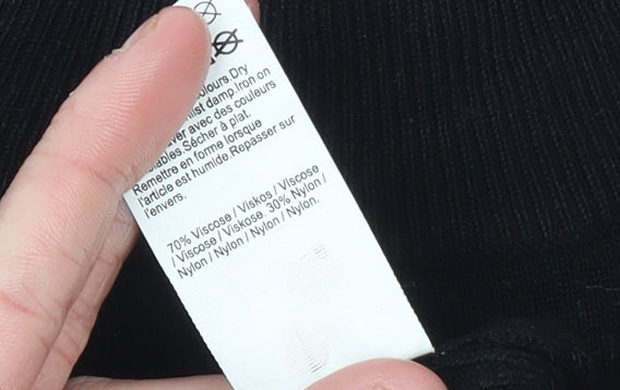 This chic black jumper from River Island is designed to offer a sophisticated and versatile look for modern women. Crafted from a soft and stretchy viscose and nylon knit blend, this long sleeve pullover offers both comfort and style. The slim fit silhouette complements the figure beautifully, making it perfect for wearing alone or layering under tailored coats or jackets. The elegant high neckline features a delicate ruffled edge, adding a subtle feminine touch. Balloon-style puff sleeves taper into long ribbed cuffs, giving a structured yet soft aesthetic that enhances its contemporary appeal. Ideal for cooler autumn and winter months, the lightweight yet warm knit makes this piece highly wearable from day to night. It pairs effortlessly with tailored trousers, high-waisted skirts or casual denim for a polished look suitable for the office, dinner outings or relaxed weekends. The jumper’s stretchy fabric ensures a comfortable fit, while its minimalist design makes it a timeless wardrobe essential that can easily be dressed up or down. Condition is excellent, showing only minimal signs of gentle wear with light linting typical for the material. Originally a high-street favourite piece from River Island, this jumper provides that perfect combination of trendy design, everyday comfort and versatility that will become a favourite in any collection. With its subtle detailing, soft texture, and flattering cut, it’s an ideal choice for those seeking understated elegance with a hint of modern flair. Add this staple to your collection for an effortlessly chic look all season long.