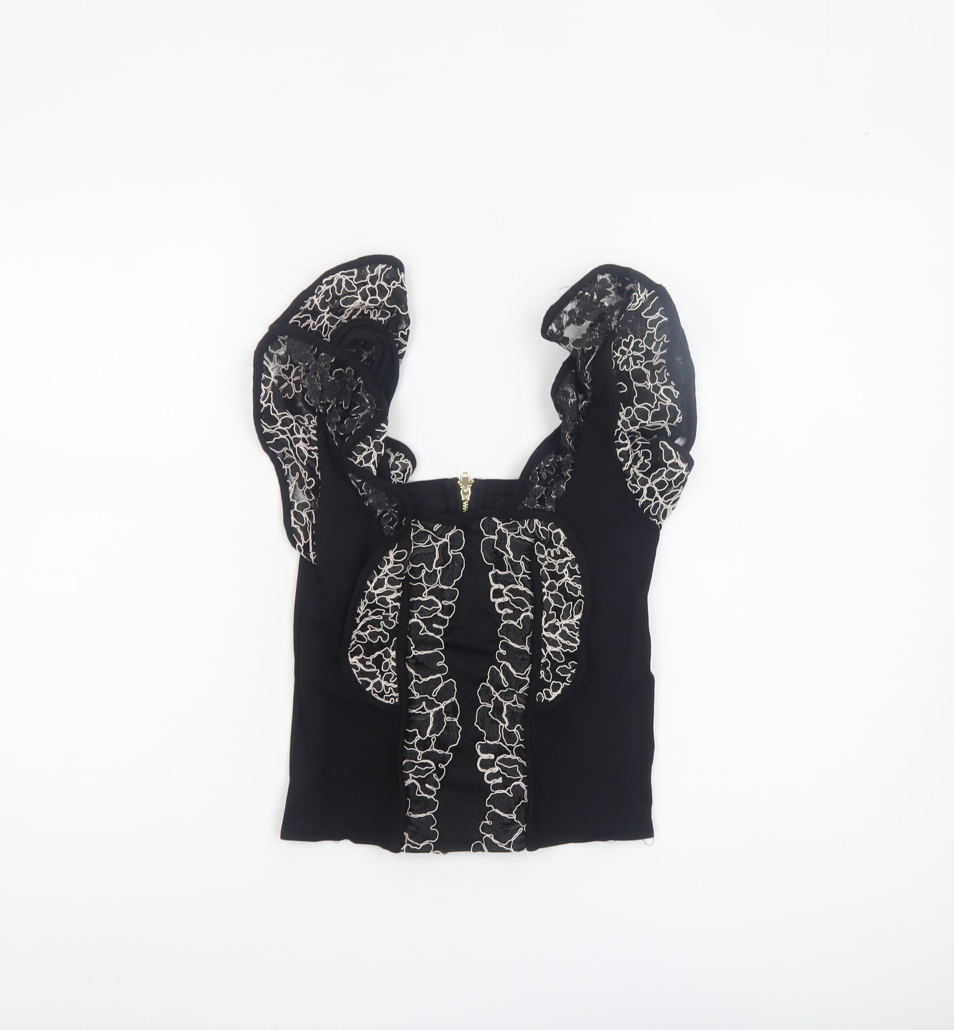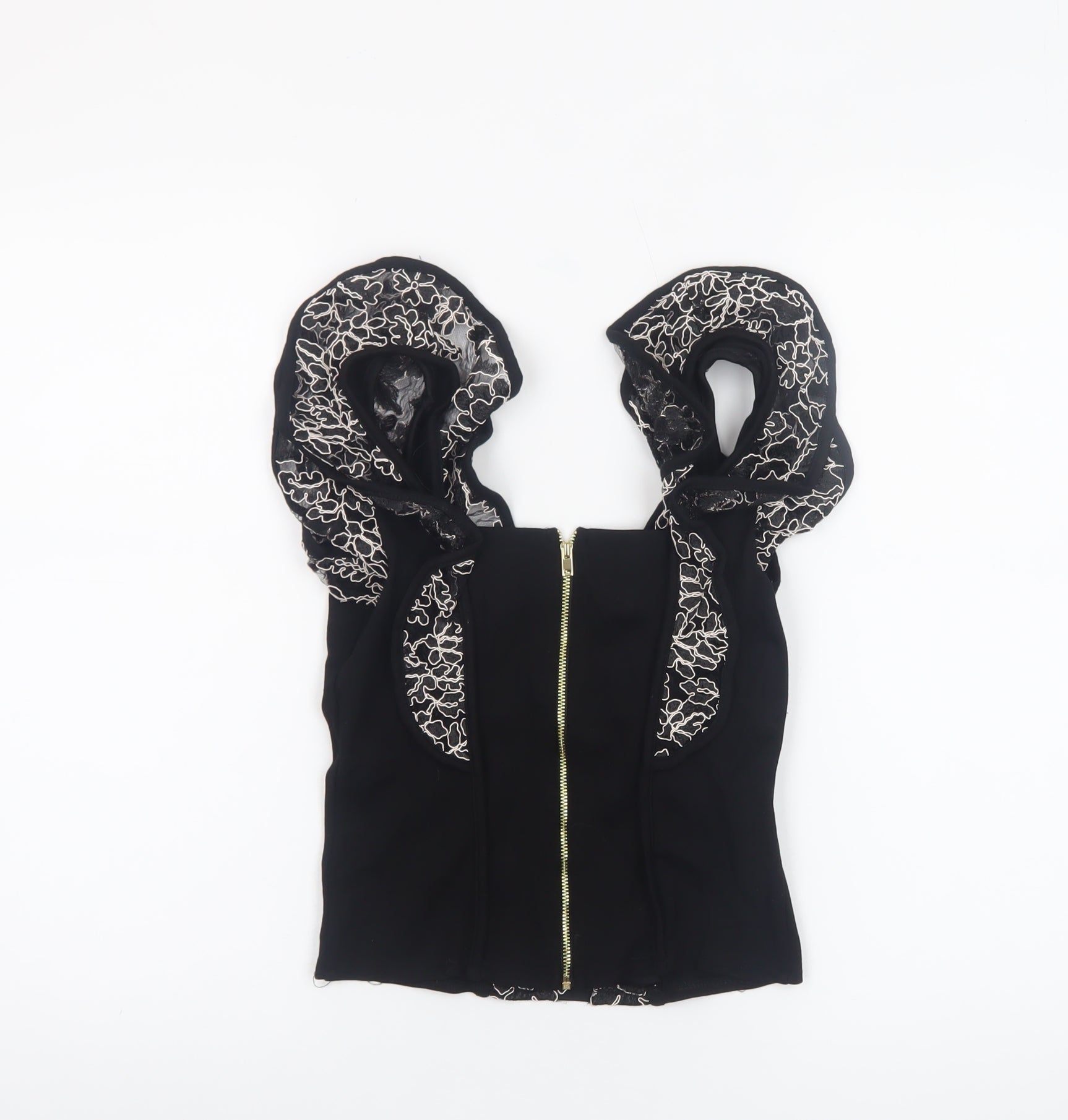 Add a dose of contemporary elegance to your wardrobe with this stunning River Island women’s black lace camisole blouse in size 10. Crafted with a sleek silhouette and intricate floral embroidered lace detailing, this top exudes femininity and sophistication in equal measure. The sleeveless design and sculpted ruffle-style straps give it a distinctive edge, perfect for both day-to-evening transitions. Made primarily from polyester blended with nylon, the blouse feels smooth against the skin while offering durability and comfort, ideal for warmer months or layering under jackets on cooler evenings. The structured fit enhances your figure, while the square neckline and zip fastening at the back deliver a refined and flattering shape. Lightweight and lined for comfort, this embellished cami top pairs effortlessly with tailored trousers, pencil skirts, or even high-waisted jeans to create a chic and confident look. Its elegant black hue and subtle shimmer in the lace make it versatile for formal dinners, cocktail parties, or stylish evening gatherings. Designed for modern women who appreciate quality and fashion-forward details, this River Island blouse embodies the perfect balance of glamour and practicality. Whether accessorised with statement jewellery or worn alone to celebrate its intricate design, it remains a timeless piece in any collection. In excellent pre-loved condition with no visible flaws, this garment promises lasting style and versatility, ensuring it stands out on any occasion. For an effortlessly sophisticated look, invest in this River Island black lace camisole — a wardrobe essential that seamlessly combines style, comfort, and elegance for the contemporary woman seeking to make a refined impression every time she steps out.