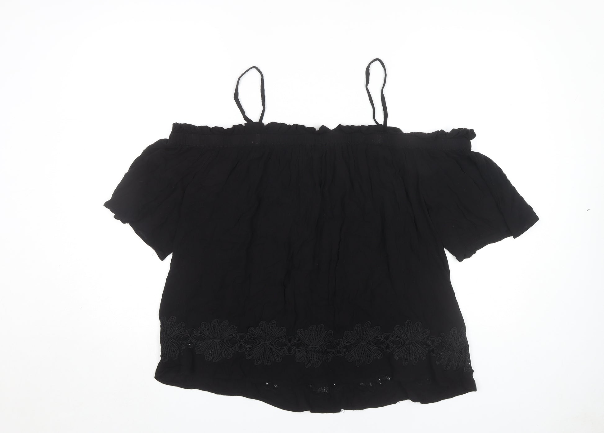 Elevate your summer wardrobe with this chic River Island women's blouse. Designed with an off-the-shoulder neckline and delicate spaghetti straps, this blouse boasts a relaxed fit perfect for casual outings. Made from soft viscose with beautiful polyester lace accents, it provides comfort and style. The elegant black hue adds a touch of sophistication, while the embroidered detailing complements its stylish design. Ideal for casual occasions or a summer day out, this blouse is machine washable for convenient care. Embrace effortless elegance with this new piece, complete with its original tags.