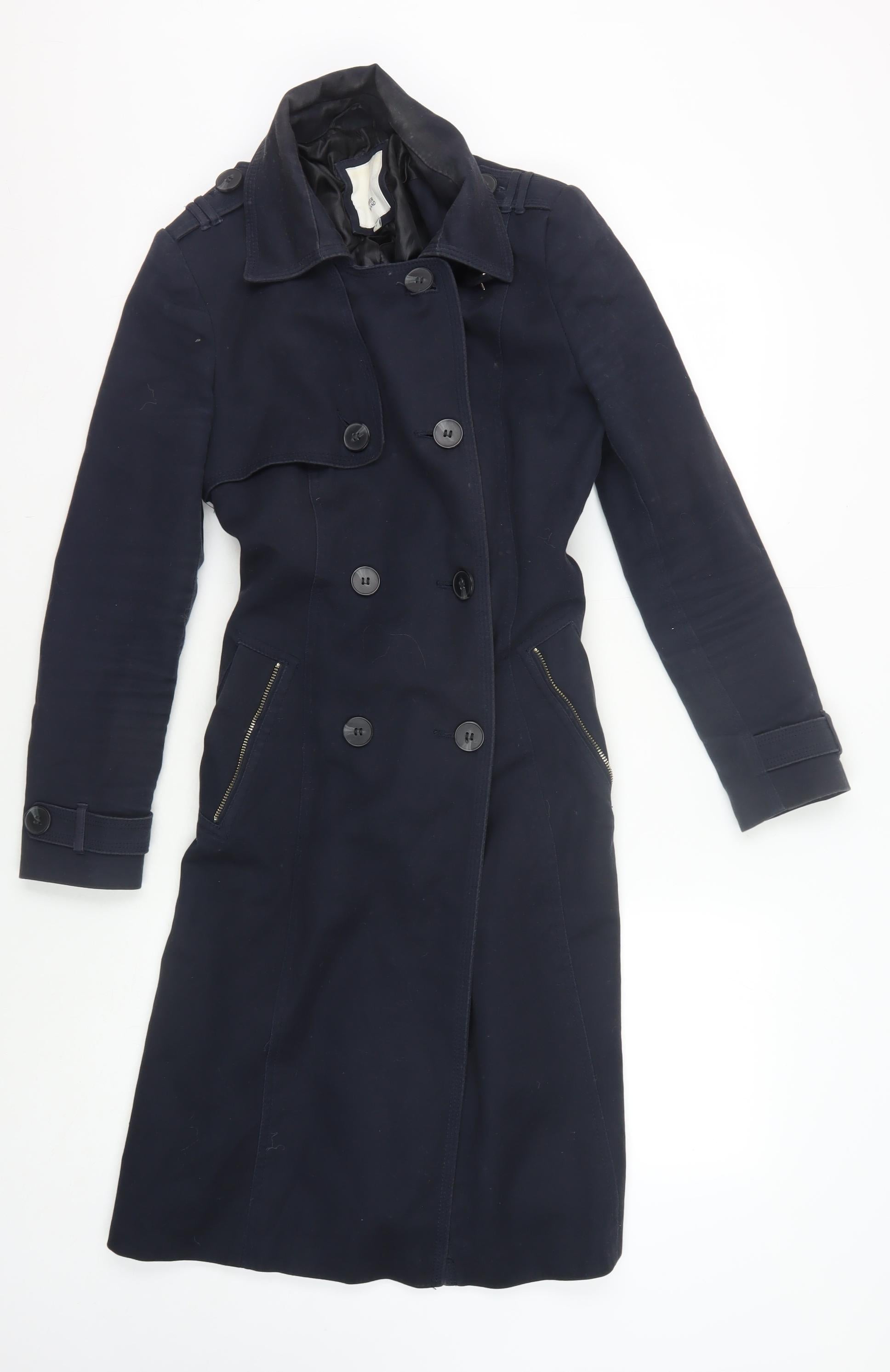 Elevate your outerwear collection with this classic River Island trench coat, designed specifically for women. Crafted in elegant black, this coat provides a sophisticated look suitable for both casual outings and more refined occasions. Made from a durable blend of 96% cotton and 4% elastane, the coat assures flexibility and comfort. It features a chic belted design with a traditional long trench cut, offering a flattering silhouette and added warmth. Stylish button accents contribute to its timeless appeal, ensuring you stay fashionable throughout autumn and winter. The coat's twill fabric enhances its structure while the polyester lining ensures a smooth fit. Its long sleeves are perfect for cooler weather, making it an ideal piece for the transitional seasons. Immaculately maintained, this trench coat exhibits minimal signs of wear, standing in excellent condition. Secure your look with its button closure, and embrace the charm of its classic theme, making it an essential in your wardrobe.