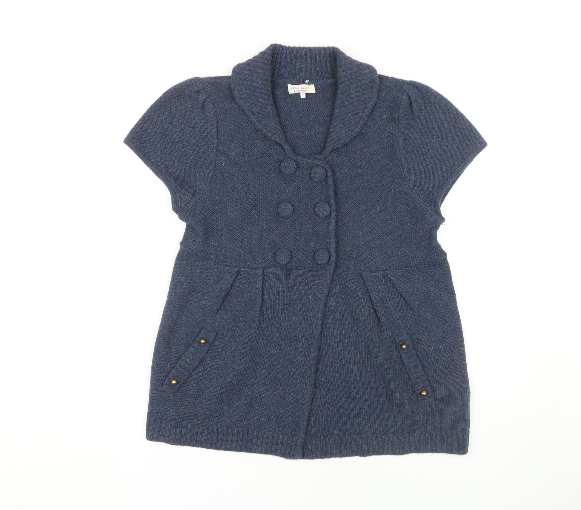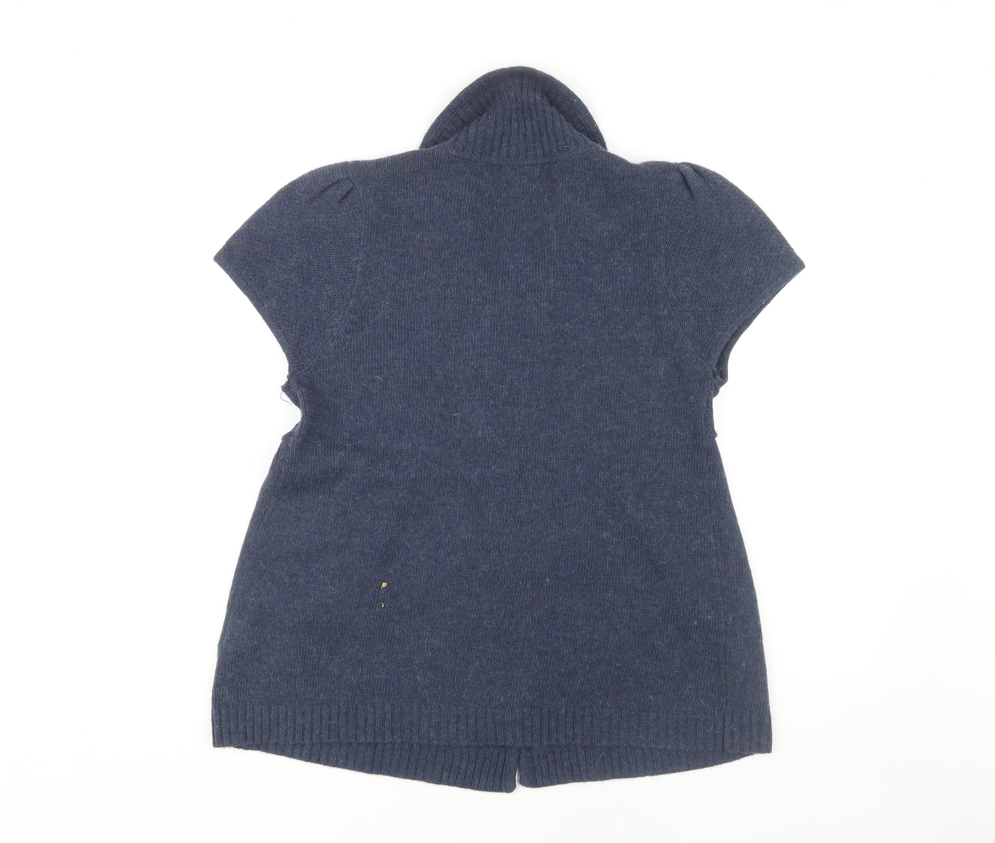 This charming River Island women's cardigan is an ideal pick for those looking to enhance their wardrobe with a touch of classic style. Crafted in a beautiful blue shade, this short sleeve cardigan is perfect for layering during the cooler months of autumn and winter. Its heavyweight design ensures warmth without sacrificing comfort or style.The cardigan is expertly knitted into a chunky-knit pattern that offers both visual and texture appeal. It features a stylish button accent down the front, adding a sophisticated touch to the overall design. The materials used in its composition include wool, polyamide, acrylic, and angora. These are blended to provide a soft, durable, and slightly fluffy texture that complements the snug fit of the garment.Designed for a regular size fit, this piece can effortlessly elevate casual outfits, making it a fantastic addition to any wardrobe staple. Although there are no intricate patterns, the plain design offers versatility, allowing it to be paired easily with a variety of outfits, whether it's with jeans for a casual look or over a dress for a more polished ensemble.River Island's reputation for quality shines through in this cardigan's excellent condition. No visible damages or wear are present, ensuring you have a garment that looks as good as new. It's perfect for day-to-day wear or for those cozy nights in.This is an opportunity to own a high-quality, stylish cardigan from a renowned brand at an attractive price. Grab it now and complement your collection with a piece that seamlessly combines comfort and style.