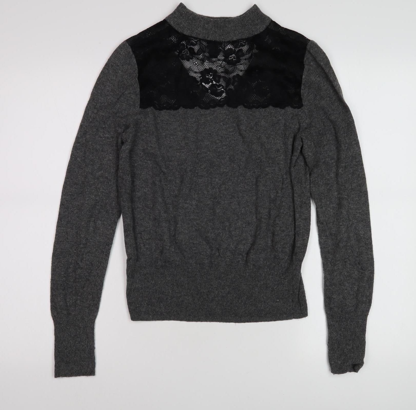 Elevate your wardrobe with this elegant River Island women's pullover jumper, designed to keep you stylish and cosy throughout the cooler months. Perfectly crafted for the modern woman, this timeless piece in a versatile grey hue offers a sleek and classic appearance. The jumper features a subtle lace accent that adds a touch of femininity and charm to the overall design, setting it apart from standard knitwear. Designed in a comfortable long sleeve and a regular fit, this knitwear is ideal for casual outings and lends itself beautifully to a variety of occasions from work to leisurely weekends. Made from a a quality wool blend, this jumper ensures warmth and comfort without compromising on style. Its timeless design is further enhanced by a no-pattern knit style, making it adaptable for pairing with your favourite outfits. Wear it over a collared shirt for a smart-casual look or pair with jeans for an effortless day out. Whether you're layering it over other garments or wearing it as a standalone piece, this jumper promises breathability and snugness. An essential for any fashion-forward wardrobe, it offers a sleek appearance while keeping wearability at its core. Ideal for autumn and winter, it acts as a stylish layer against the chill. With its elegant lace accents, this River Island jumper becomes more than just a basic pullover, turning any ensemble into a chic statement. Delight in the fine craftsmanship and style that River Island is known for, and make this jumper a staple piece in your collection. Grab yours now and step out in confidence and comfort.