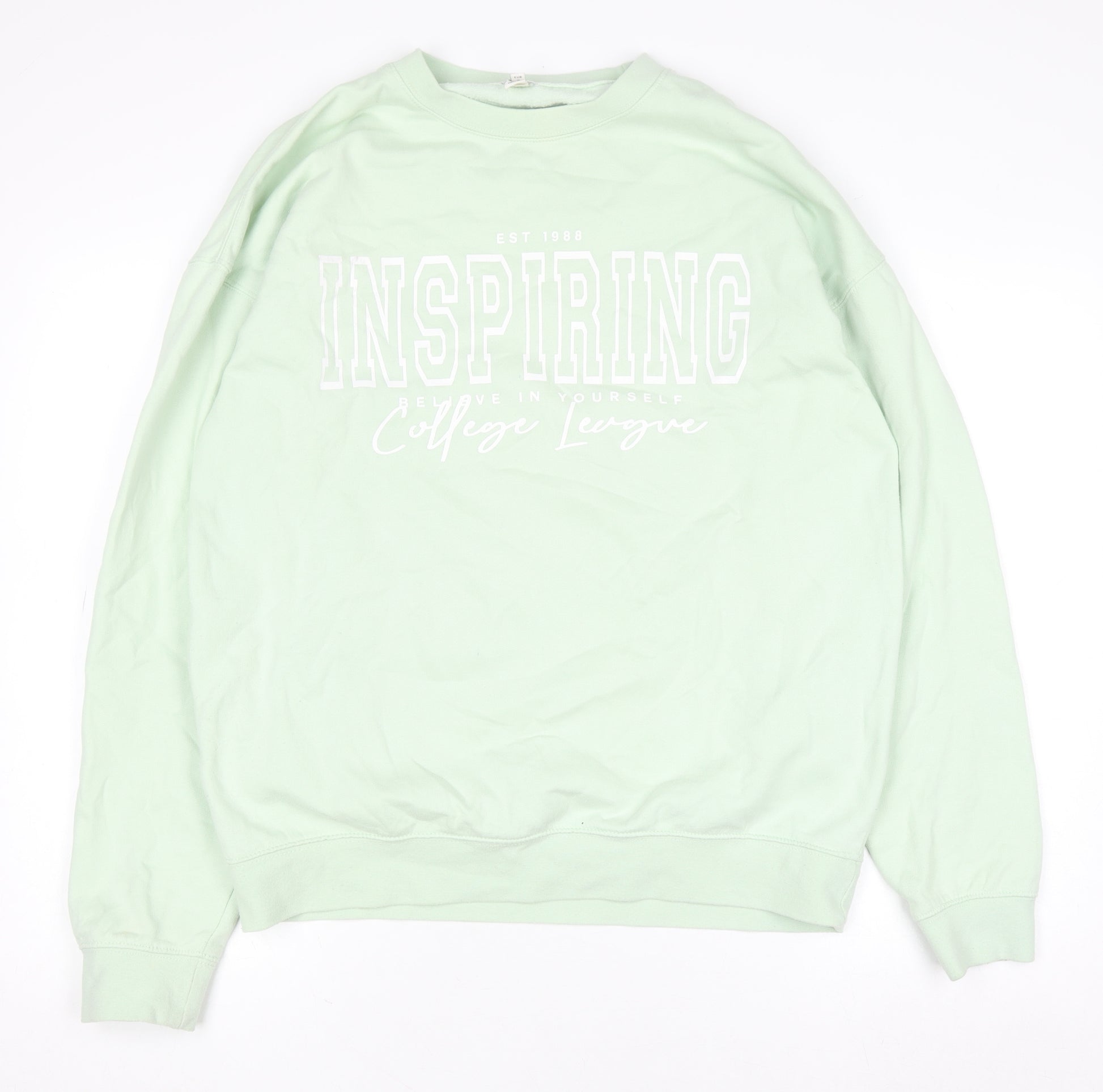 Stay effortlessly stylish and comfortable with this River Island women’s mint green pullover sweatshirt. Designed in a relaxed fit, this soft jersey jumper is made from a blend of cotton and polyester, giving it a lightweight yet cosy feel. The fresh pastel green shade brings a modern, refreshing tone to any wardrobe, ideal for layering across seasons. The front features bold white varsity-style lettering that reads ‘Inspiring College League’, giving it a classic collegiate look with a contemporary inspirational twist. The crew neckline, ribbed hem, and cuffs add structure and durability, making it perfect for everyday wear. Whether paired with jeans, joggers, or leggings, this sweatshirt offers a versatile style suitable for everything from casual weekends to relaxed days out. Designed to provide easy care and long-lasting comfort, this piece embodies River Island’s balance of quality and urban fashion flair. Perfect for those who love smart-casual, sporty aesthetics with a positive vibe, this sweatshirt will be a favourite for laid-back dressing throughout autumn, winter, and spring. Step into relaxed confidence and effortless charm every time you wear this soft mint green pullover.