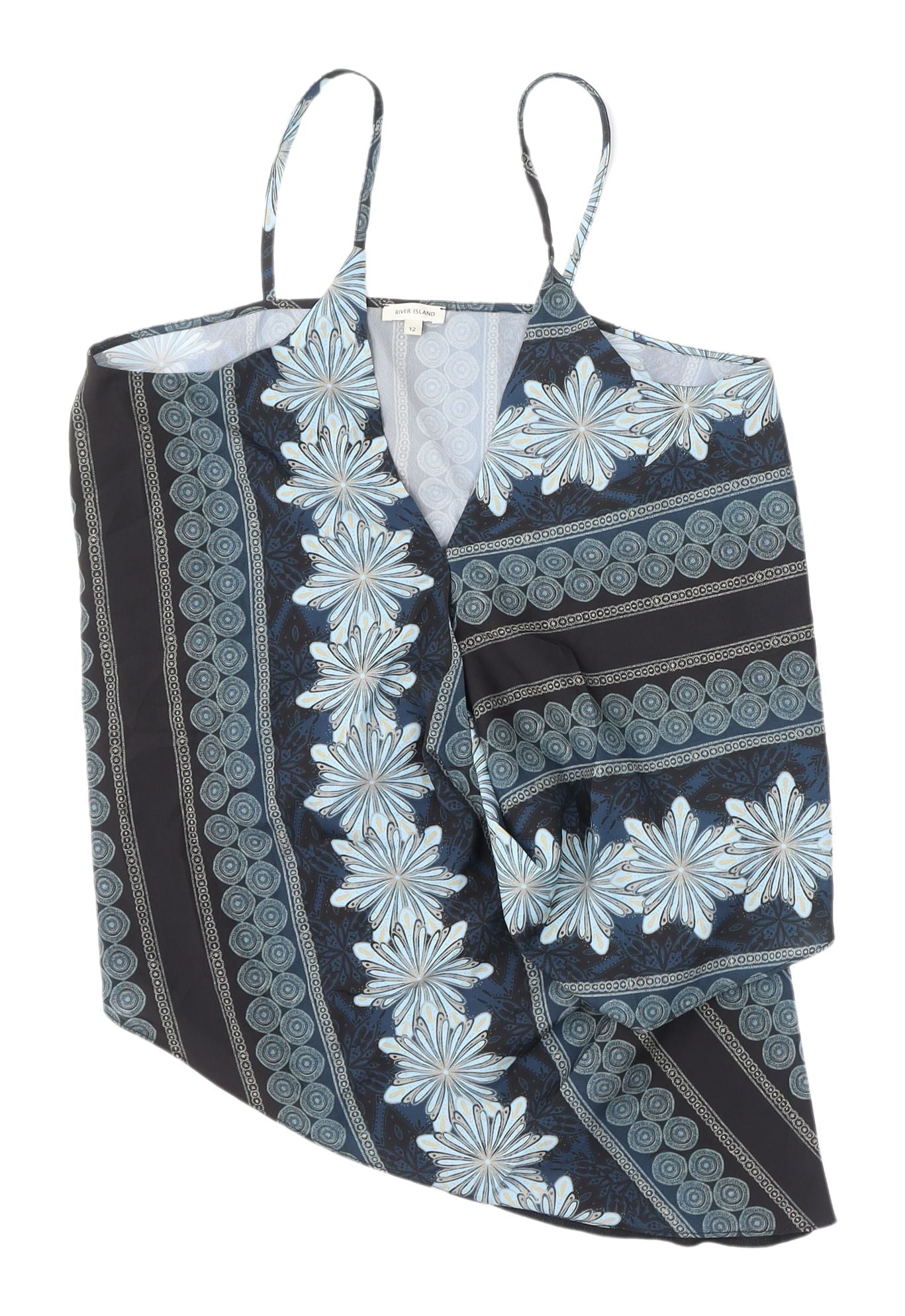 Step into effortless elegance with the River Island Women's Multicoloured Camisole Tank. Designed with a striking geometric pattern in vibrant hues, this top captures both style and comfort, making it an ideal addition to any spring or summer wardrobe. Crafted from luxurious satin polyester, it boasts a soft, silky texture perfect for day-to-night transitions. The tank features a flattering V-neckline and delicate spaghetti straps, adding a touch of sophistication to your casual ensemble. Its sleeveless, pullover style ensures ease of movement and comfort for any occasion, whether you're heading to a casual brunch or a sunny day out. Pair it with your favourite jeans or a chic skirt for a versatile look that’s sure to turn heads. This camisole is machine washable for your convenience, ensuring that it looks fabulous with minimal effort. Offered brand new with tags, this top is available at an unbeatable price, reflecting its excellent condition and quality craftsmanship. Upgrade your wardrobe with a piece that embodies both modern flair and timeless appeal.