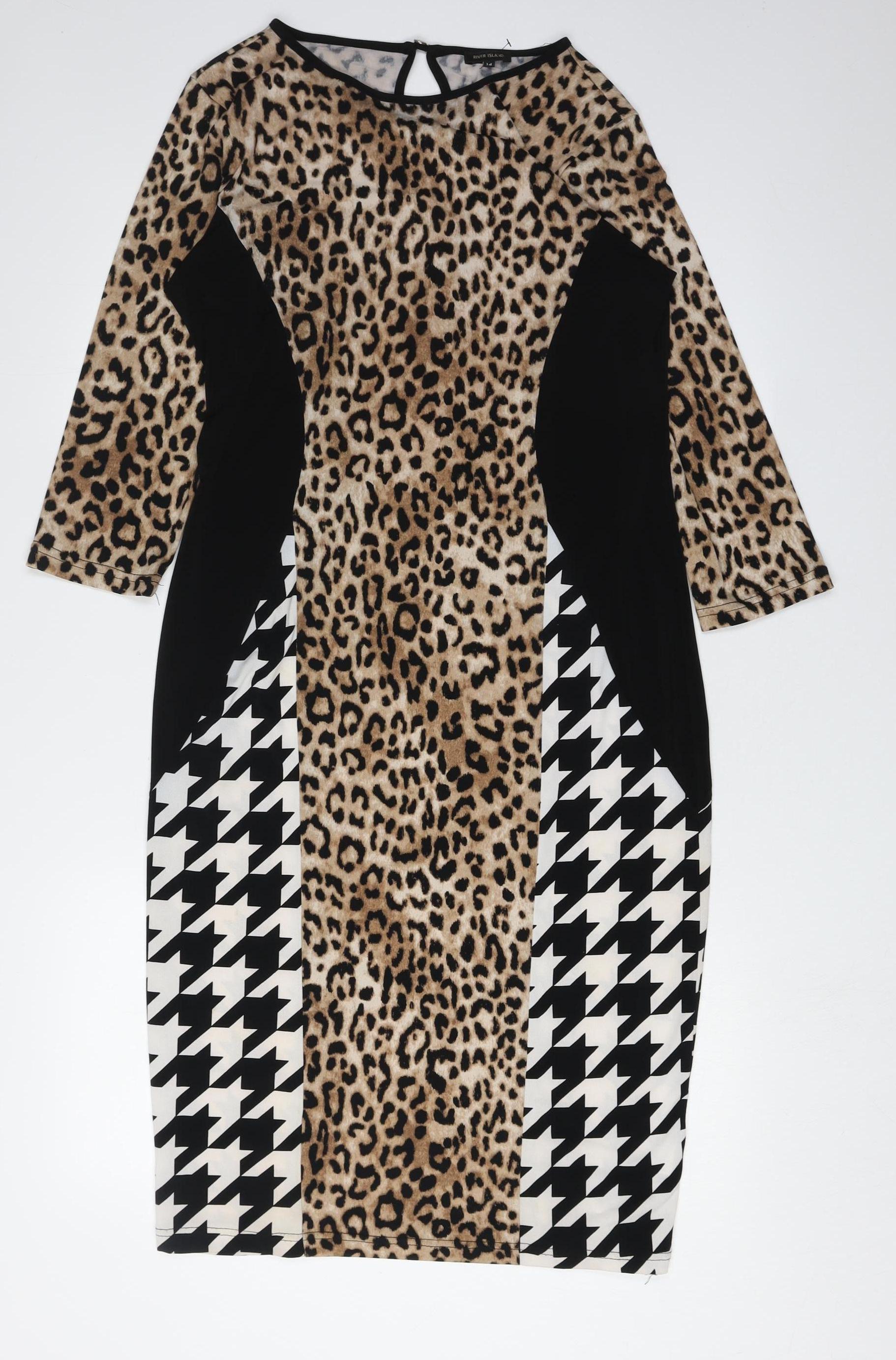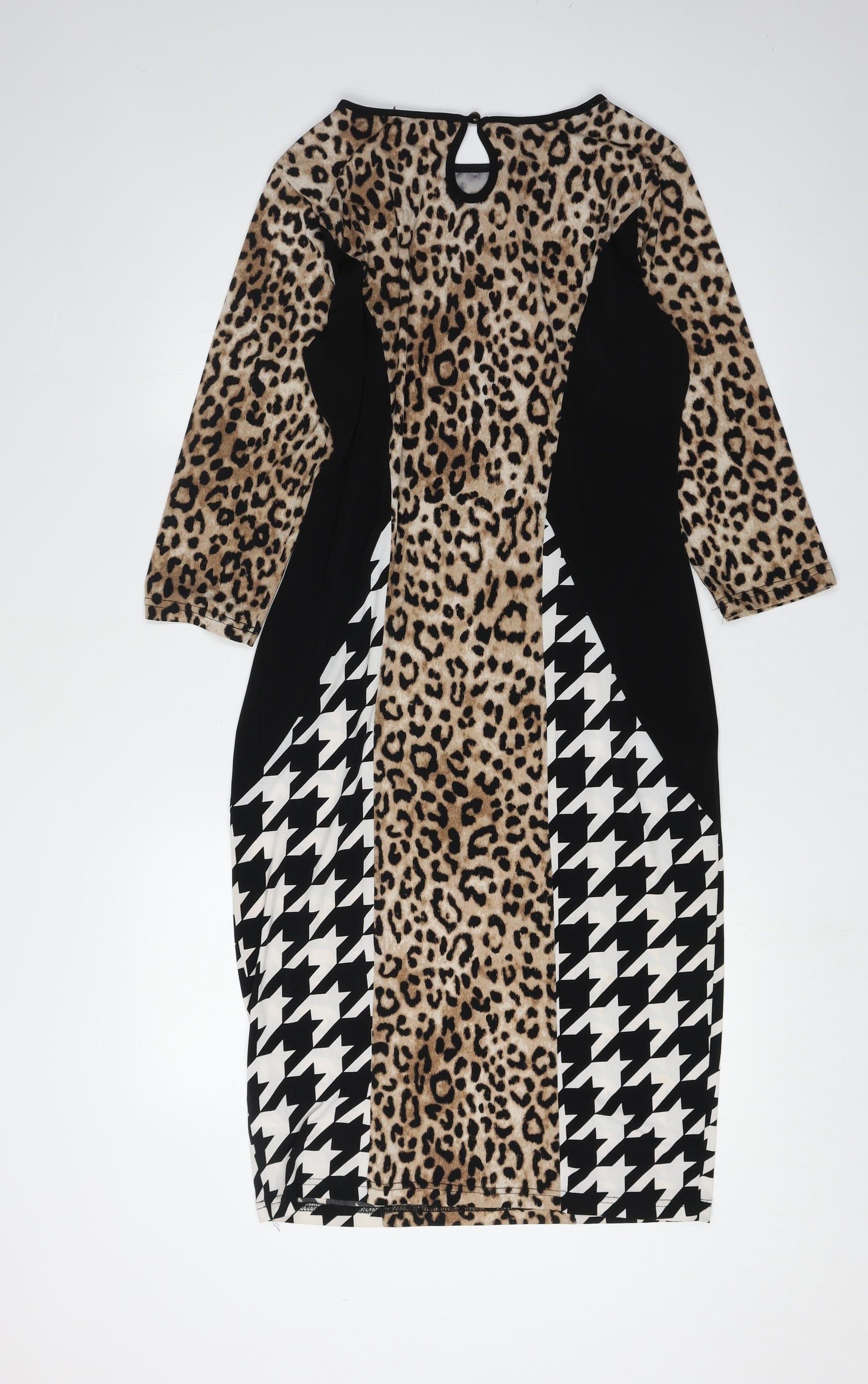Step up your style game with this striking River Island dress, perfect for the fashion-forward woman. Designed in a size 14, this dress combines a bold blend of animal print and classic houndstooth patterns, ensuring you stand out in any crowd. The three-quarter sleeves offer a chic touch while the round neckline provides a classic silhouette. Crafted from a comfortable blend of polyester and elastane, this jersey fabric dress offers both style and ease, making it a versatile addition to your wardrobe. Whether you're heading out for a casual day out or a night on the town, this multicoloured piece promises to be a conversation starter. Invest in a garment that defies trends and transcends seasons. With no visible defects and in excellent condition, this dress is priced attractively, making it a must-have for those who love a blend of vibrant style and comfort. Elevate any occasion with this timeless piece.