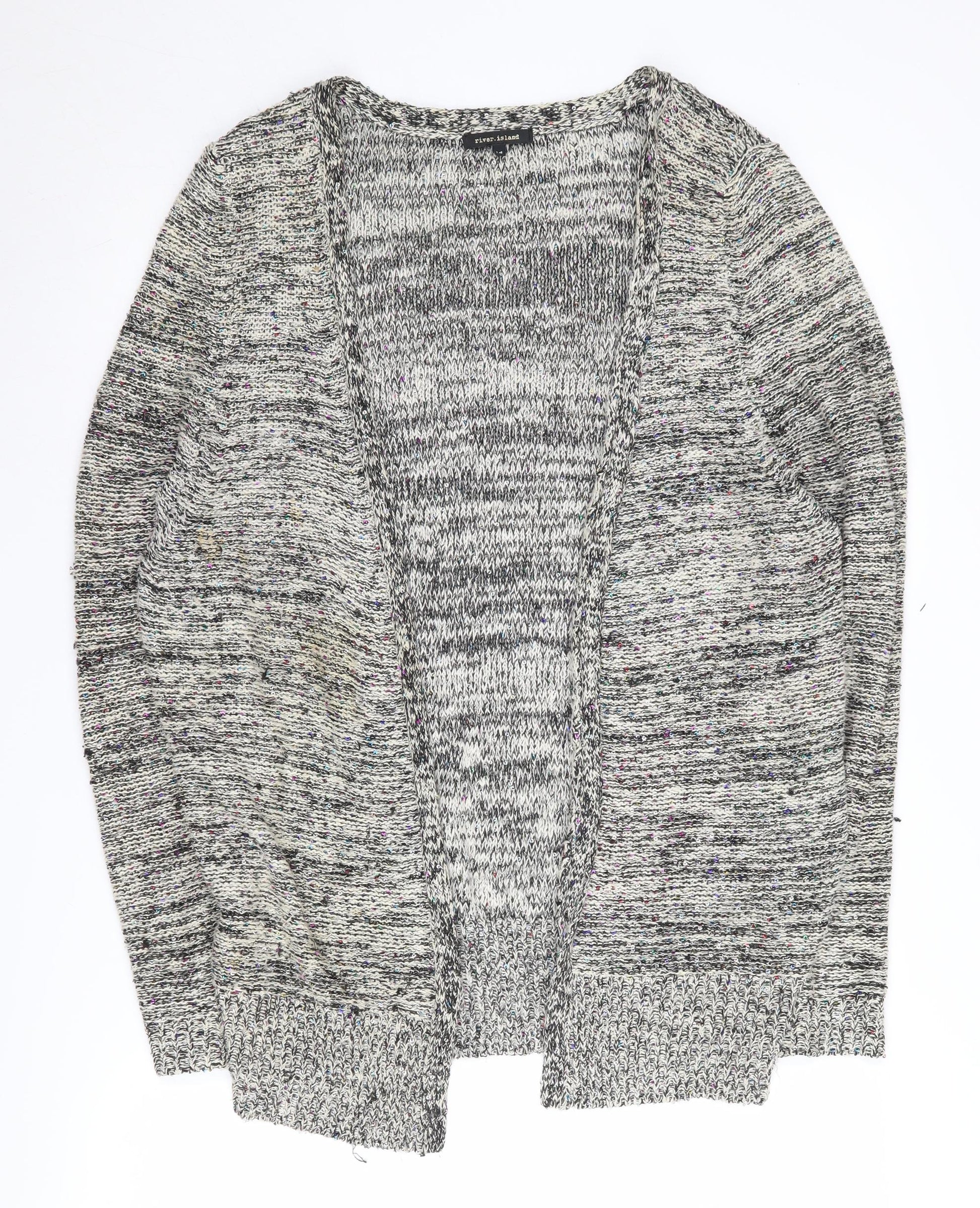 Elevate your wardrobe with this chic River Island Women's Multicoloured Sequin Cardigan, perfect for adding a touch of sparkle to your outfits. Crafted from a blend of 55% Polyester and 45% Cotton, this chunky-knit cardigan offers both style and comfort, making it an ideal layering piece for the Autumn and Winter seasons. The long sleeves provide warmth on cooler days, while the open design allows for a relaxed, casual fit. This regular size 14 cardigan is accented with subtle sequins that catch the light, adding a hint of glamour to your ensemble. Whether dressing up for a casual outing or keeping it cozy indoors, this versatile piece complements any look effortlessly. Despite being slightly worn and featuring a minor stain, it remains in very good condition, ready to bring flair to your collection. Pair it with jeans and boots for a laid-back style, or layer it over a blouse for an effortlessly elegant appearance. Secure this River Island treasure at an unmatched value and infuse your closet with a touch of modern elegance.