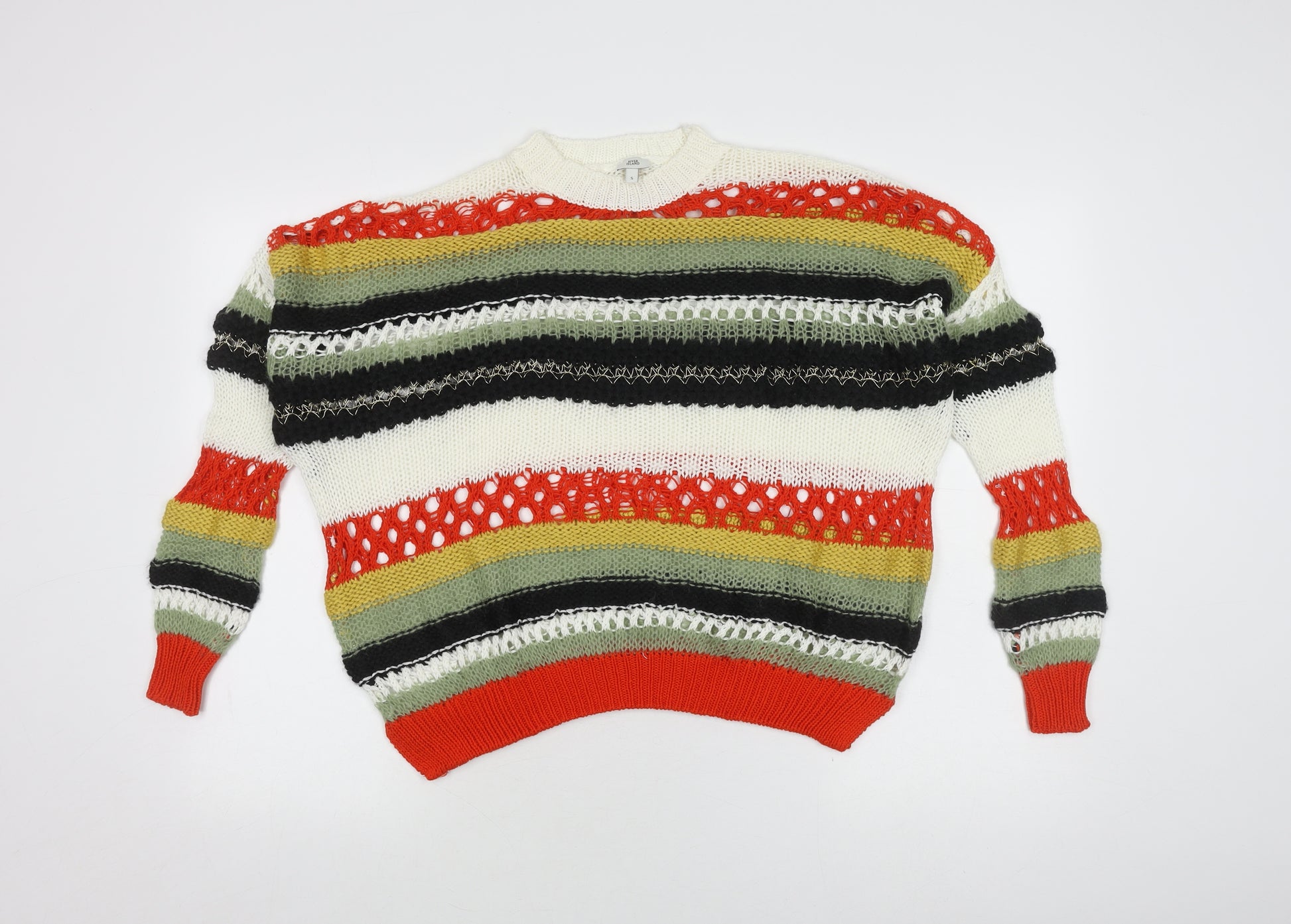 Embrace a vibrant yet casual style with this multicoloured striped jumper from River Island. Perfect for adding a splash of colour to any outfit, this jumper features a mock neck design and long sleeves, offering warmth and style for everyday wear. Crafted with an open-knit pattern, the jumper blends bold stripes and an airy feel, making it ideal for layering over a simple top. Whether paired with jeans for a casual outing or dressed up with a skirt for a night out, this versatile sweater will be a welcome addition to your wardrobe. The regular fit ensures comfort, while its youthful design makes it a perfect choice for women who love a touch of fun in their fashion. This jumper is in excellent condition, with no visible flaws or signs of wear, ready to refresh your collection with a burst of colour. The lightweight knit offers flexibility throughout the seasons, allowing you to transition from autumn chills to spring breezes with ease. Elevate your wardrobe with this distinctive piece that promises not just excellent craftsmanship but also unmatched versatility.