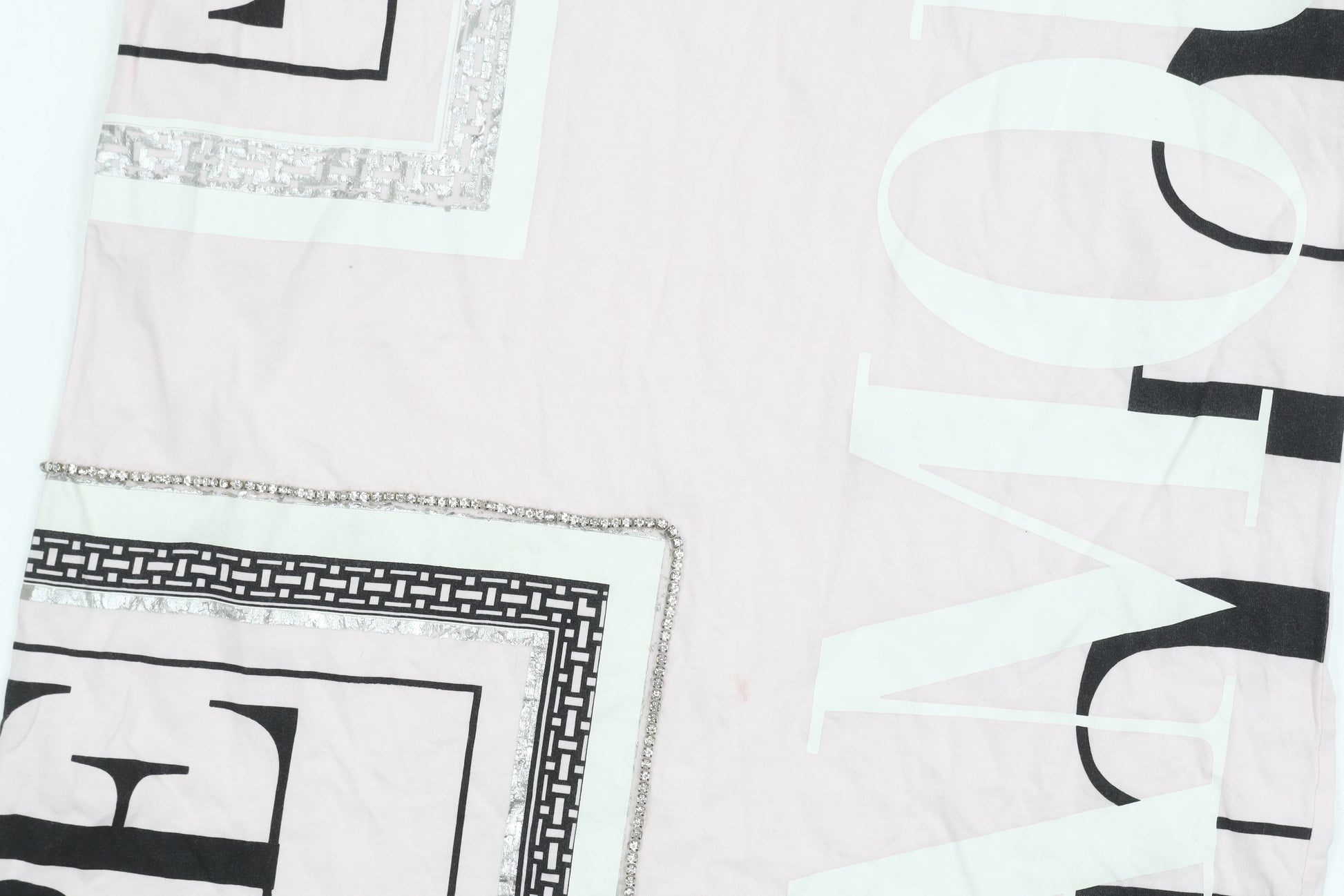 Make a stylish addition to your wardrobe with this River Island Women's Pink T-Shirt, perfect for casual outings and sunny days. Crafted from 100% cotton, it ensures comfort and breathability throughout the day. The short sleeves and regular fit provide a relaxed yet stylish look, suitable for spring and summer seasons. The defining feature of this piece is its rhinestone accents, adding a touch of sparkle to the soft pink colour, making it stand out from the usual basics. Featuring a classic round neckline, this T-shirt is easy to pair with your favourite jeans or skirts for a complete and chic ensemble.The pullover style and machine washable fabric make it both practical and easy to care for. With its subtle graphic pattern, this T-shirt from River Island ensures you look effortlessly fashionable whether you're out for a casual coffee or enjoying a day out shopping. Size 10 fits well under the regular size category, offering a great fit for everyday wear.Although gently used, this item remains in very good condition with only minor signs of wear, ensuring you get a high-quality garment at an excellent value. Ideal for the fashion-conscious woman who appreciates a mix of comfort and trendiness in her wardrobe. Add this River Island T-shirt to your collection and enjoy the versatility and style it brings to your outfit options.