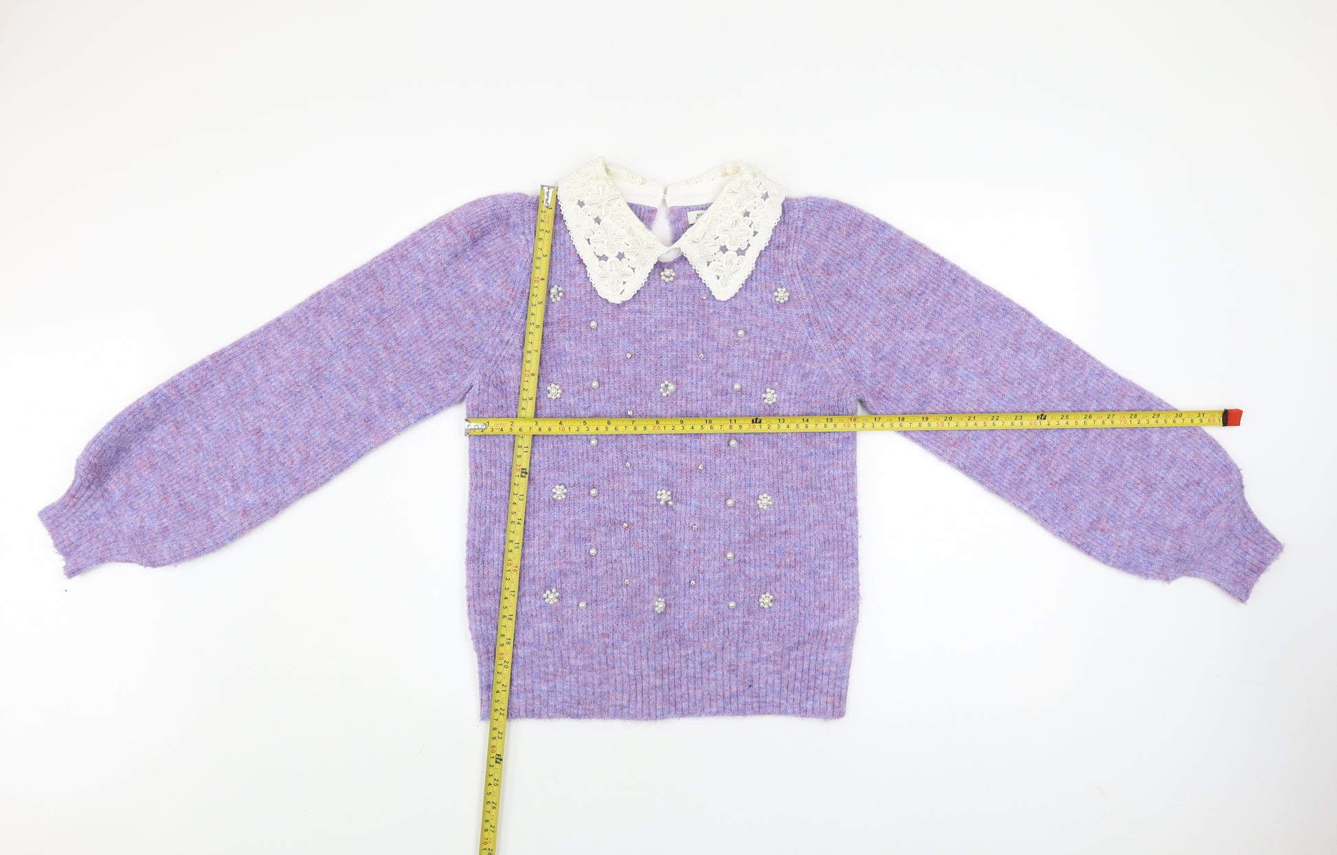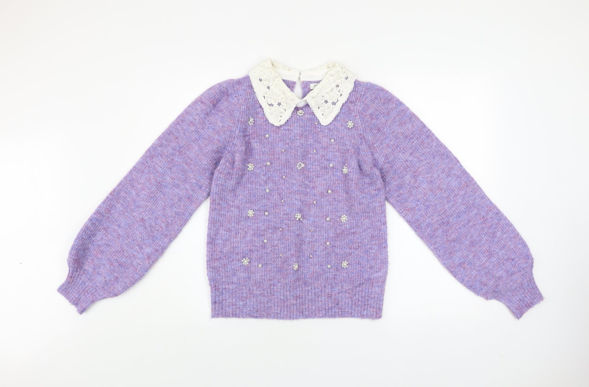 Elevate your knitwear collection with this charming women’s jumper from River Island. Crafted in a soft, blended knit of polyester, nylon, and wool, this light purple pullover combines classic femininity with playful detailing. The standout feature is its delicate ivory crochet collar, complete with intricate embroidered accents that give a touch of vintage charm while keeping your look stylish and modern. Small pearl and bead embellishments adorn the front, creating a subtly sparkling effect that brings elegance to your outfit without overwhelming it. Designed for comfort and sophistication, the jumper offers a relaxed yet flattering fit in a size 10. The long, puffed sleeves taper into ribbed cuffs, ensuring a cosy feel for cooler seasons. Its collared neckline elevates the piece for occasions that require a polished appearance, whether you’re heading out for brunch, casual gatherings, or an evening get-together. This knitwear piece has a soft and warm texture, perfect for autumn and winter layering, providing both warmth and a refined aesthetic.Its classic design makes it versatile enough to pair with jeans for a laid-back weekend look or with a pleated skirt for a more dressed-up ensemble. The beaded and embroidered accents add delightful depth and personality, transforming a simple jumper into a standout statement piece. As part of River Island’s contemporary collection, this item captures a refined balance of comfort, practicality, and feminine style.In excellent pre-owned condition with no visible signs of wear, this jumper offers great quality and timeless appeal at a fraction of its original price. Perfect for those who love to mix luxury fabrics and whimsical details in their wardrobe, this River Island jumper will bring style and cosiness to every occasion.