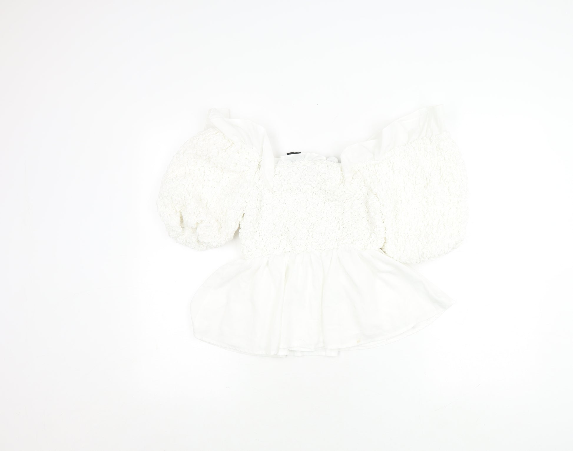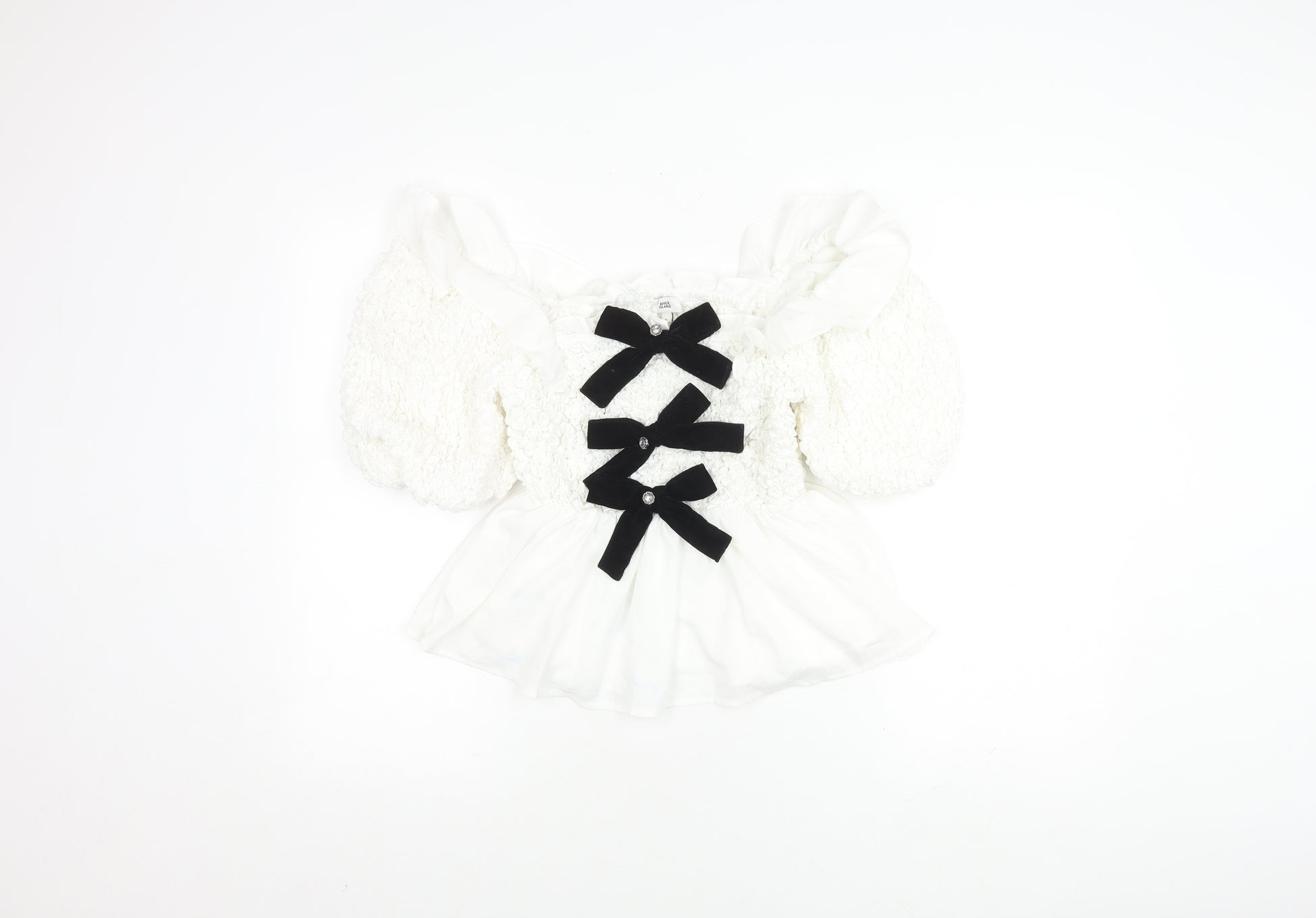 Introducing the stylish River Island Women's Blouse in an elegant white hue, showcasing a refined puff sleeve design perfect for warm summer days. This beautiful blouse is crafted from a comfortable blend of 89% cotton, 10% polyester, and 1% elastane, offering both breathability and slight stretch for a flattering fit. Designed in a classic solid pattern with chic bow accents, this piece ensures you make a statement with subtlety. Ideal for casual occasions, it pairs effortlessly with both smart jeans and chic skirts, transitioning seamlessly from day to night. Despite slight marking on the material, it remains in excellent condition, exuding both sophistication and practicality. A must-have addition to your wardrobe, this blouse embodies both style and versatility, offering timeless appeal for various occasions.