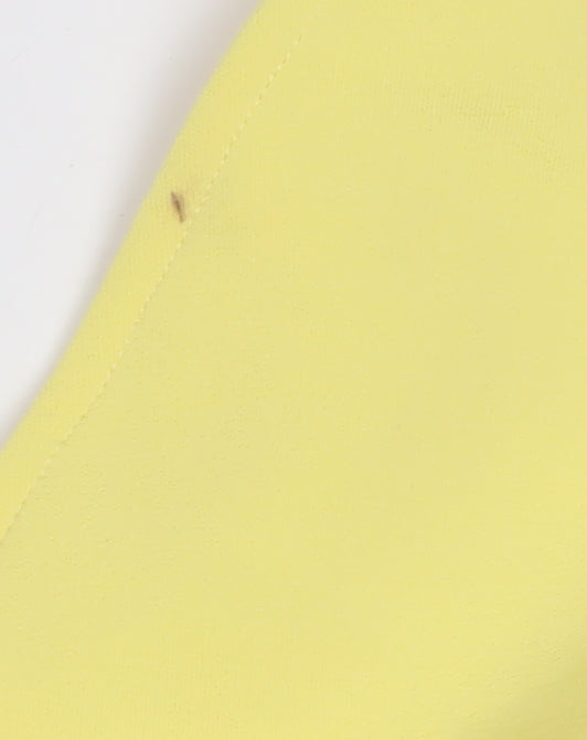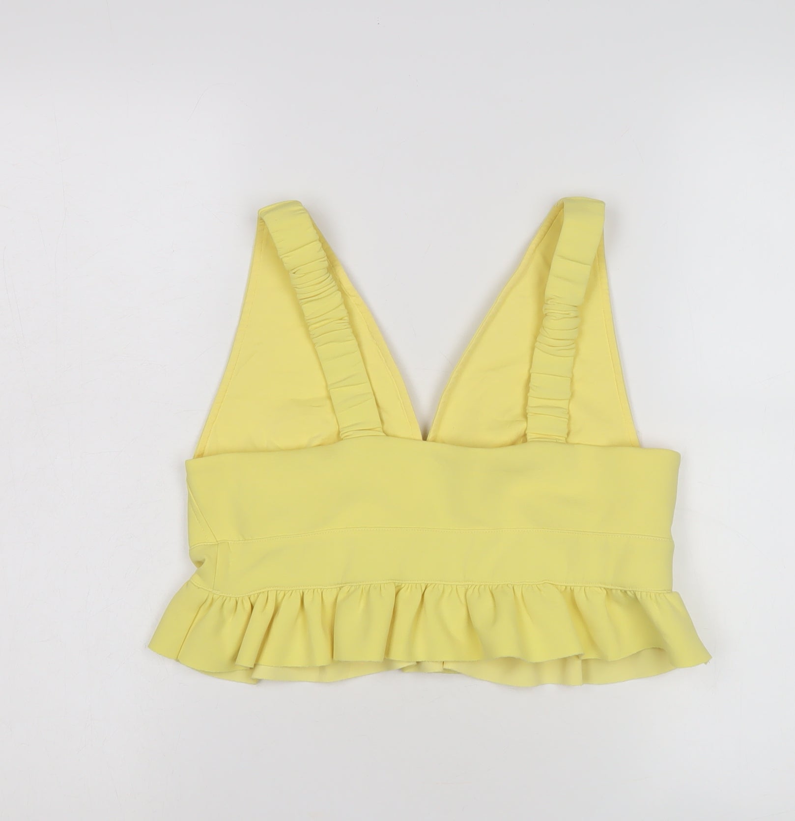Elevate your wardrobe with this chic River Island sleeveless blouse. Designed for women, this cropped, lightweight top is perfect for the warmer months of spring and summer. Crafted with a V-neck, it features a striking yellow hue that adds a pop of colour to any outfit. Constructed from soft jersey fabric with a blend of polyester and elastane, this top ensures comfort and style. Ideal for casual outings or a stylish party, it boasts a ruffled accent for an added flair. With wide straps and a regular fit, it’s easy to pair with your favourite skirt or jeans. Despite a minor mark, this piece is in very good condition, offering vibrant fashion choices for varied occasions.