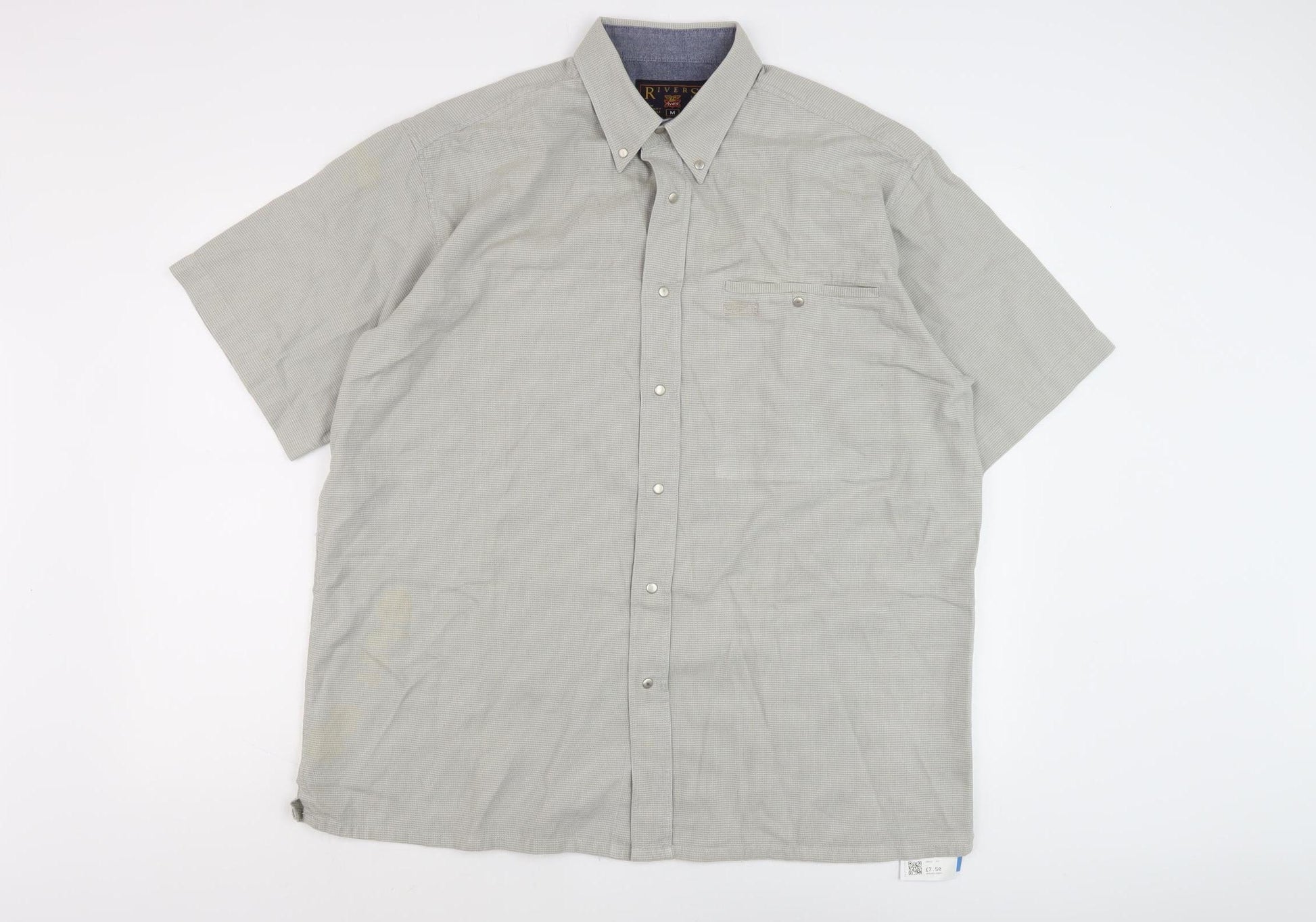 Explore effortless style with this Rivers Men's Button-Up Shirt. Crafted in a soothing beige tone and available in size medium, this short-sleeve piece is perfect for any casual occasion. The cotton material offers comfort and breathability, making it an ideal choice for spring through autumn wear. Featuring a classic button-down collar and button closure, it embodies a timeless appeal that fits seamlessly into any wardrobe. Despite slight stains, the shirt is in good condition, adding a touch of rustic charm to its appearance. Priced affordably, it's a versatile addition that pairs well with jeans or chinos, perfect for a laid-back weekend or casual weekday outing. Dive into simplicity with this reliable wardrobe staple.