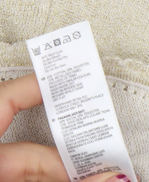 Bring a touch of delicate shimmer to your child’s wardrobe with this beautiful beige metallic cardigan from RJR John Rocha. Made for girls aged 7-8 years, this elegant piece combines comfort with understated sophistication, perfect for both everyday wear and special occasions. Crafted from a soft blend of cotton and polyester with metallic fibres woven throughout, it offers both breathability and a subtle sheen that catches the light beautifully. The cropped silhouette and single button-front closure lend a classic bolero-style fit, making it ideal for layering over dresses, tops, or party outfits. Pretty scalloped edge details on the cuffs and hem add charm, while the metallic threading brings a graceful yet playful finish. This cardigan feels lightweight and comfortable, designed to keep girls cosy without restricting movement. Given its neutral beige tone, it pairs effortlessly with a range of colours and prints. This pre-loved piece remains in excellent condition, showing minimal signs of wear and maintaining its lovely shimmer and soft feel. As part of the esteemed RJR John Rocha line, it embodies quality craftsmanship and timeless style that parents trust. Whether worn for a wedding, celebration, or a stylish day out, this cardigan will be a versatile addition to any young wardrobe, adding a refined touch that complements any outfit beautifully.